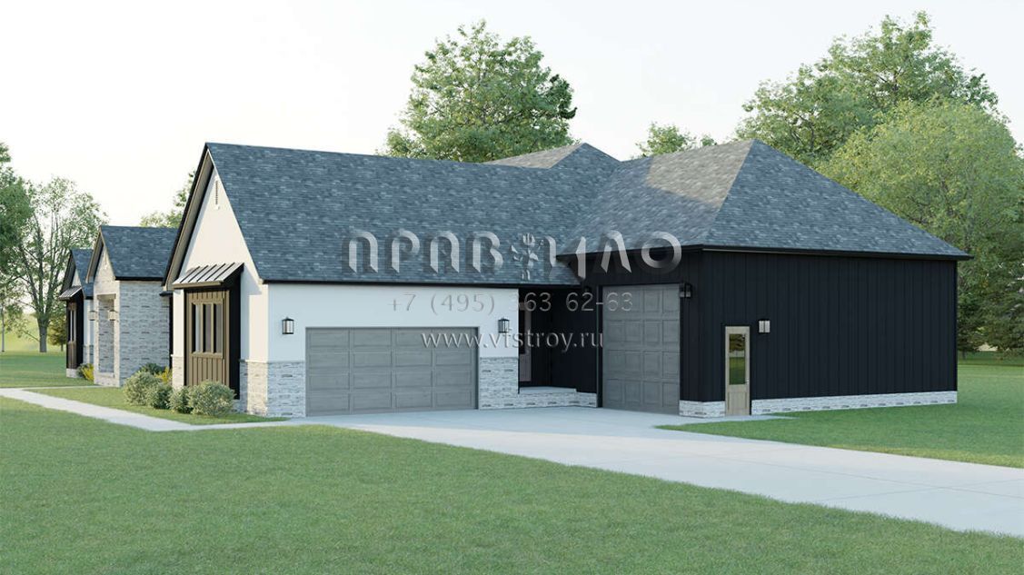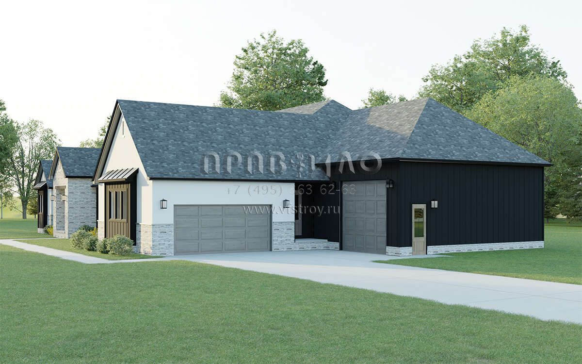 Это проект одноэтажного дома с гаражом на три и более машин жилой площадью 309 кв.м. Длина дома 22.3 м, ширина 34.7 м, высота 8.2 м. В доме четыре спальни и три санузла.