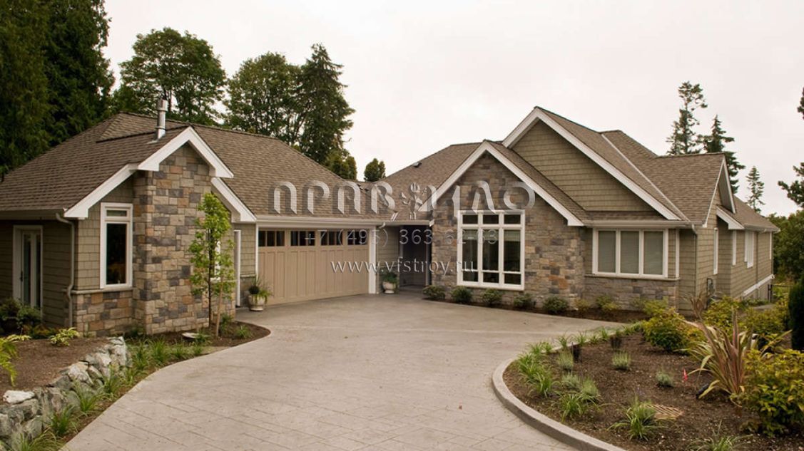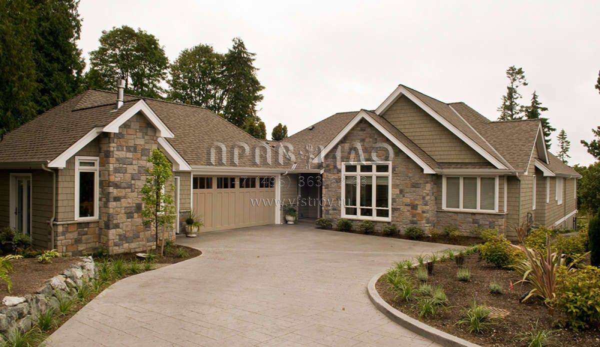Это проект одноэтажного дома с гаражом на две машины жилой площадью 309 кв.м. Длина дома 35.1 м, ширина 18.3 м, высота 6.7 м. В доме четыре спальни и четыре санузла.