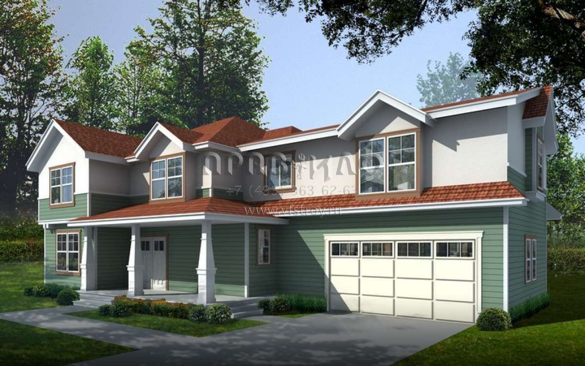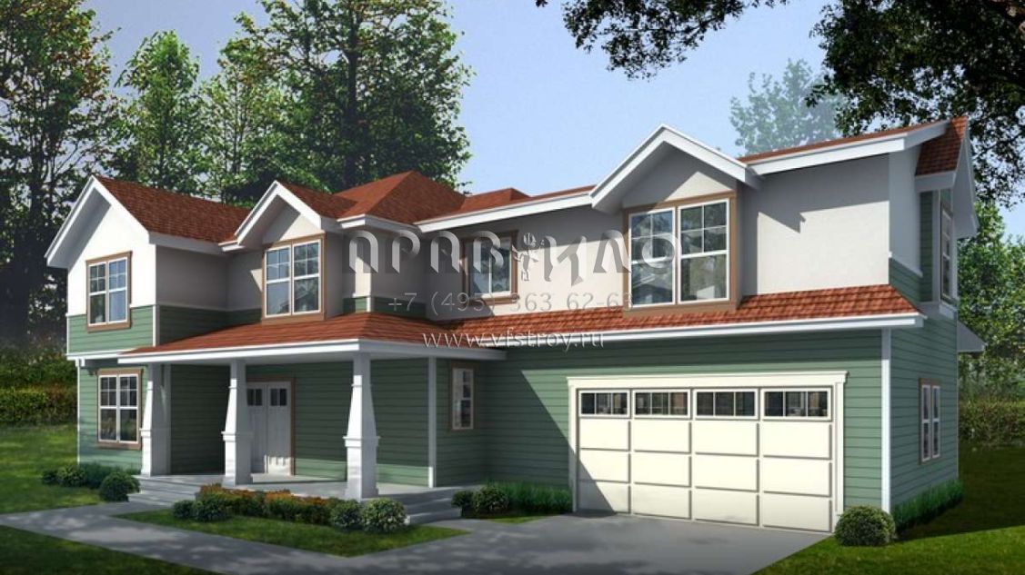 Это проект двухэтажного дома с гаражом на две машины жилой площадью 310 кв.м. Длина дома 17.1 м, ширина 18.9 м, высота 8.5 м. В доме четыре спальни и два санузла.