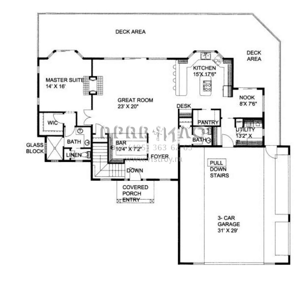 Поскольку этот проект разрабатывался иностранными архитекторами, для строительства дома требуется переработка проекта под действующие в России нормы. Данные визуализации проекта представлены для ознакомления с концепцией проекта. Проект разработан американским архитектурным бюро и представлен America's Best House Plans.