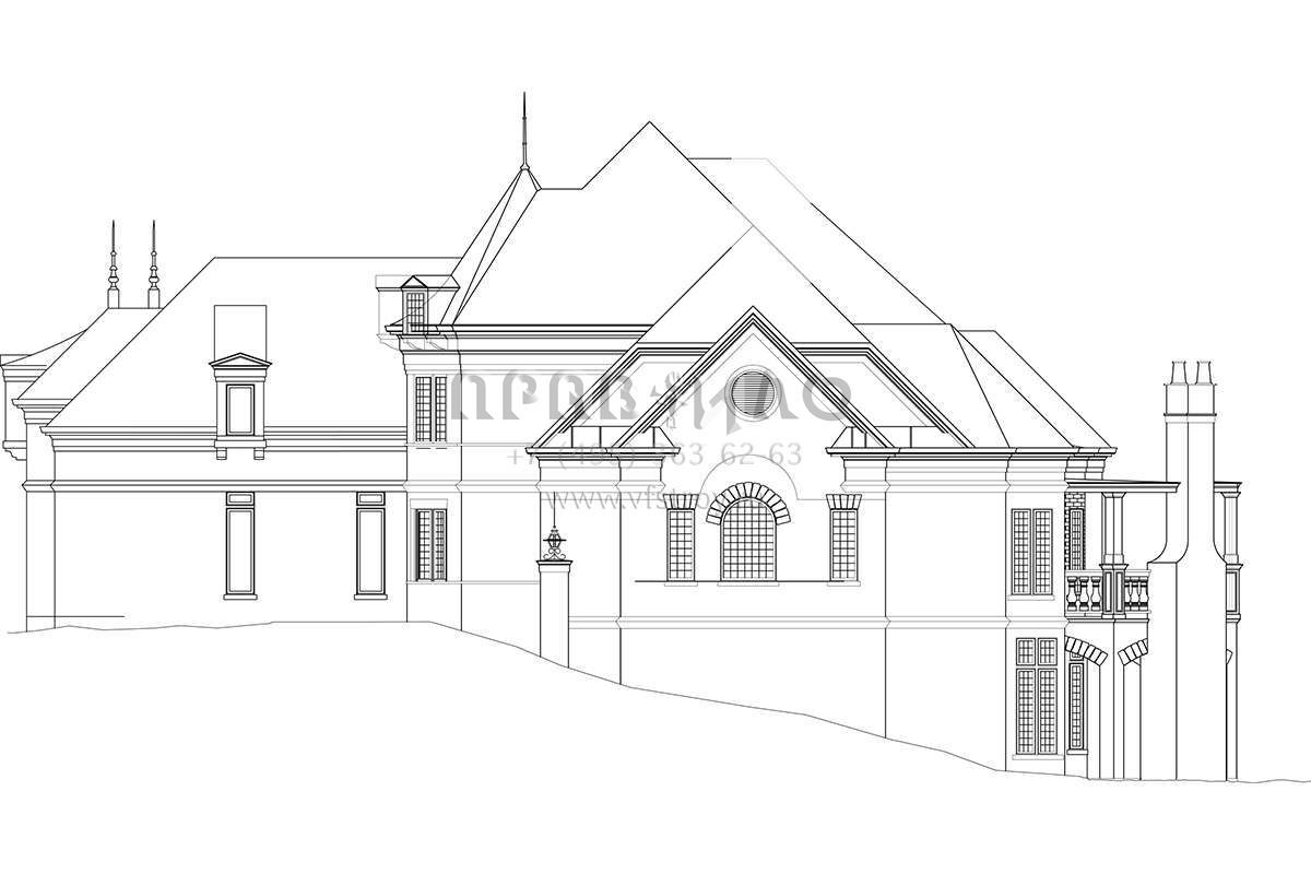 Это проект двухэтажного дома с гаражом на три и более машин жилой площадью 314 кв.м. Длина дома 26.2 м, ширина 21 м, высота 10.7 м. В доме четыре спальни и четыре санузла.