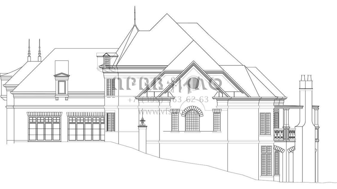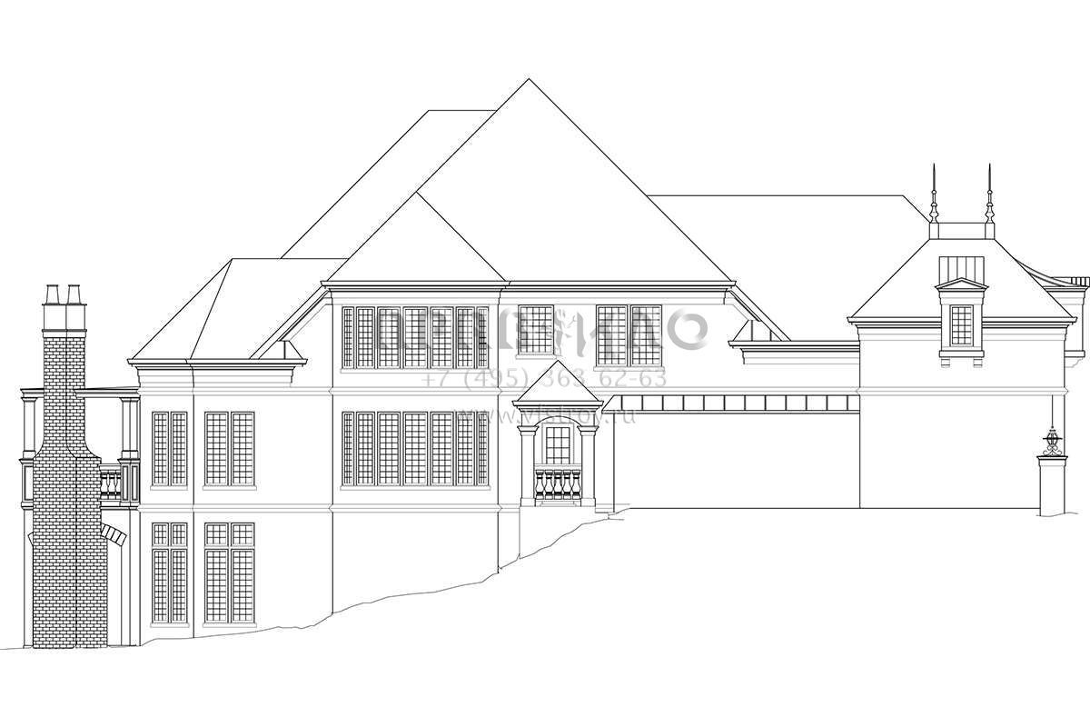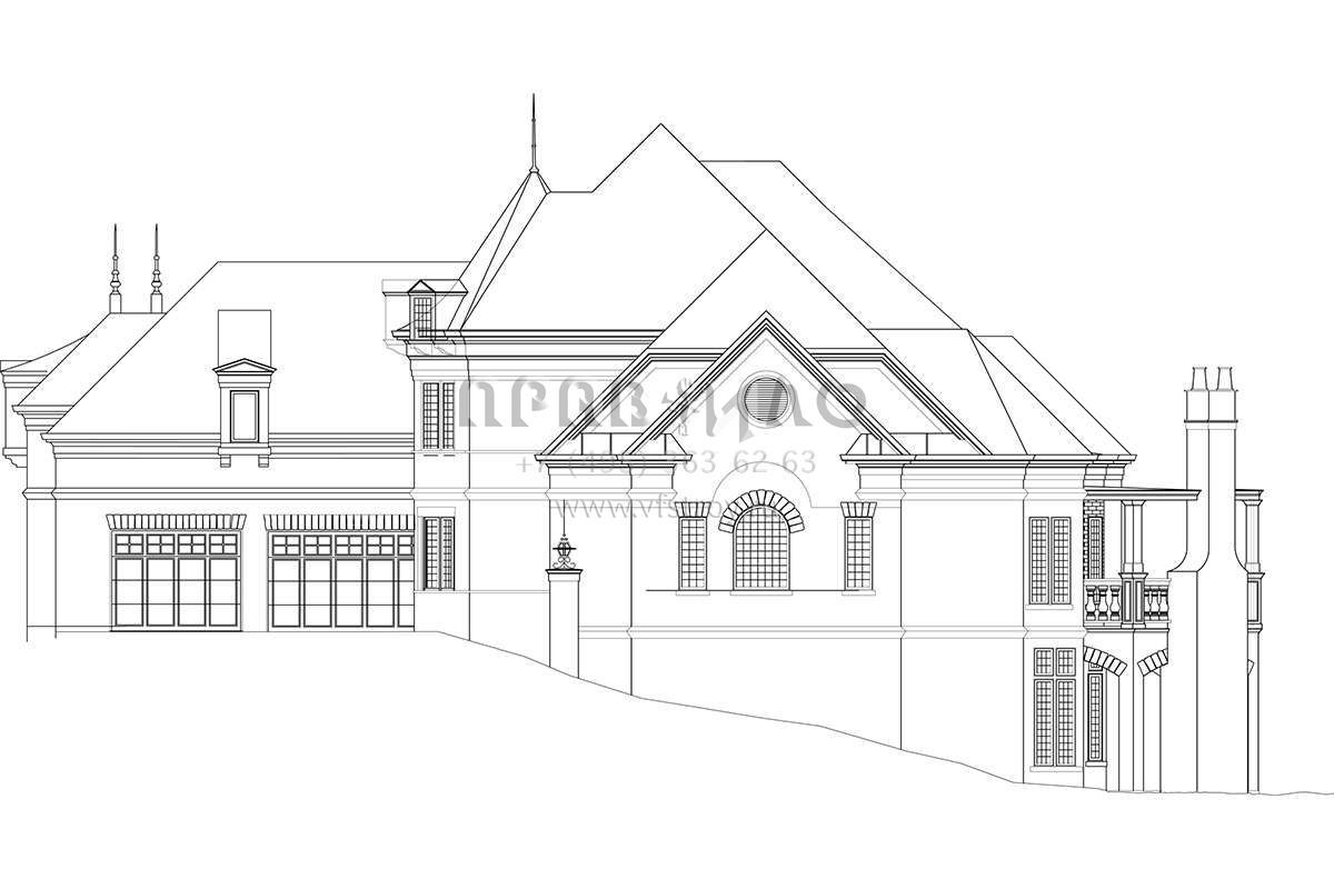 Это проект двухэтажного дома с гаражом на три и более машин жилой площадью 314 кв.м. Длина дома 28 м, ширина 21 м, высота 10.7 м. В доме четыре спальни и четыре санузла.
