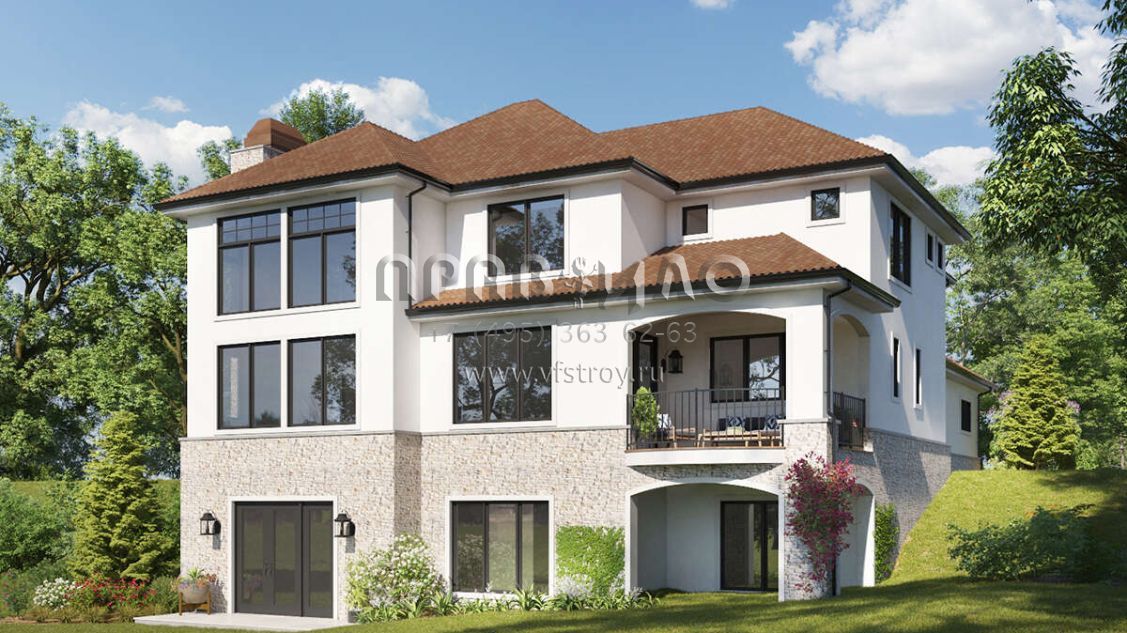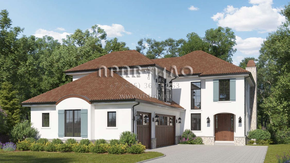 Это проект двухэтажного дома с гаражом на две машины жилой площадью 315 кв.м. Длина дома 21 м, ширина 14.3 м, высота 8.8 м. В доме три спальни и два санузла.