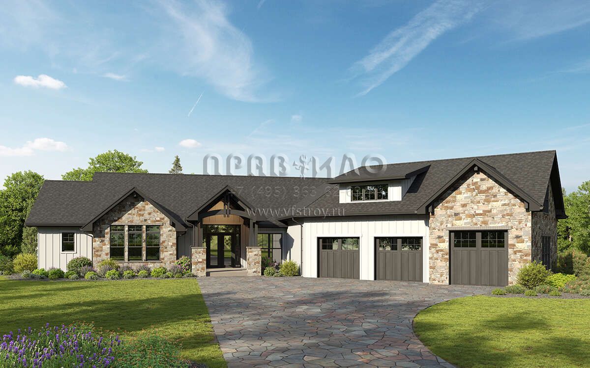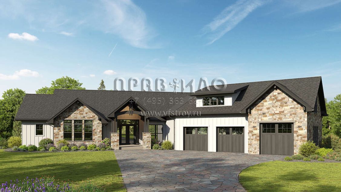 Это проект двухэтажного дома с гаражом на три и более машин жилой площадью 319 кв.м. Длина дома 29.3 м, ширина 31.7 м, высота 6.7 м. В доме три спальни и три санузла.