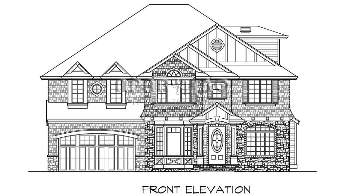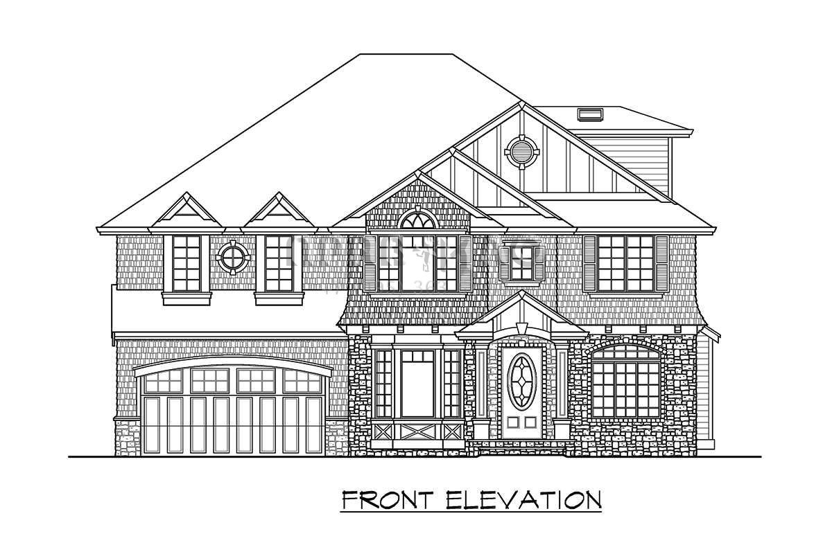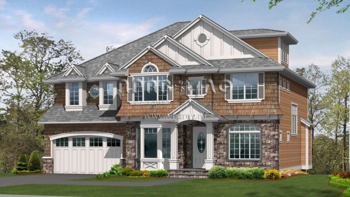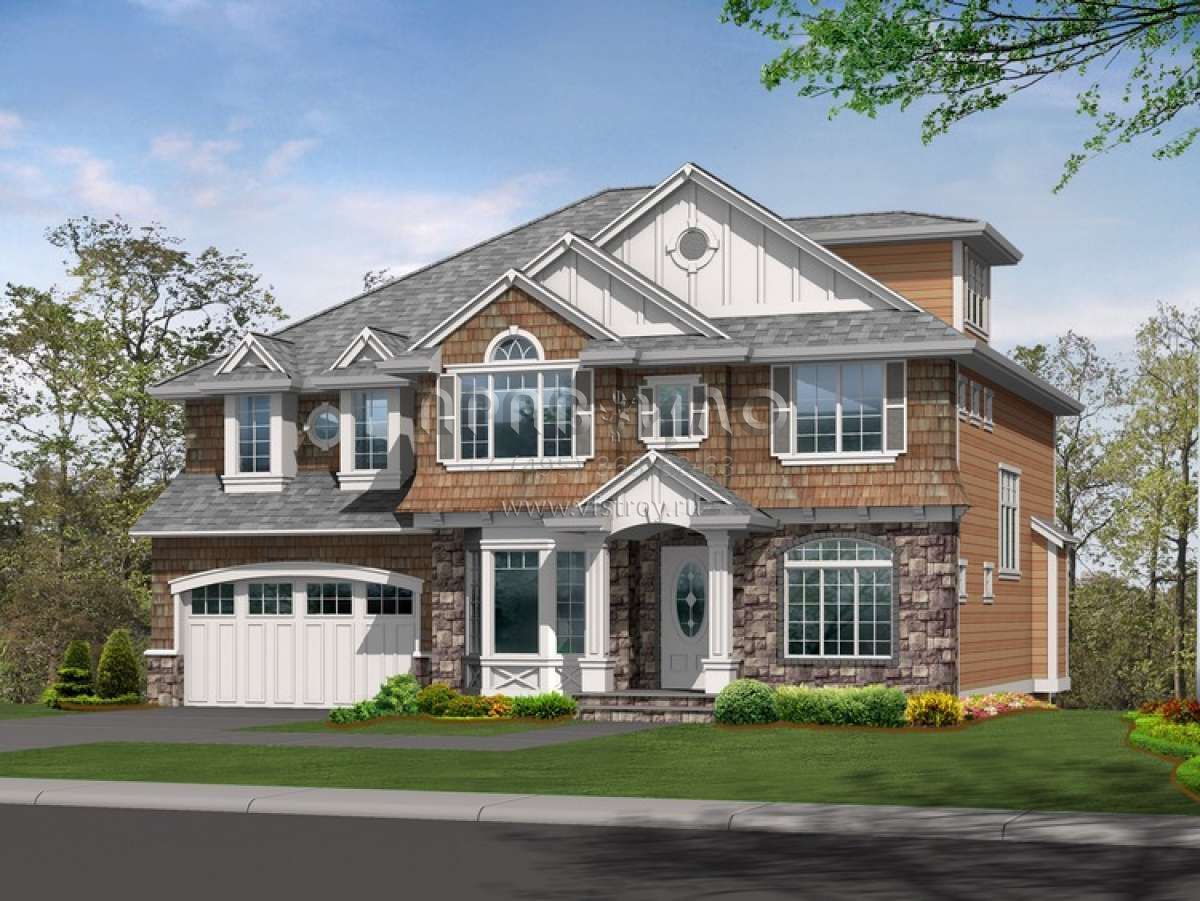 Это проект двухэтажного дома с гаражом на две машины жилой площадью 320 кв.м. Длина дома 12.2 м, ширина 15.2 м, высота 10.1 м. В доме четыре спальни и три санузла.