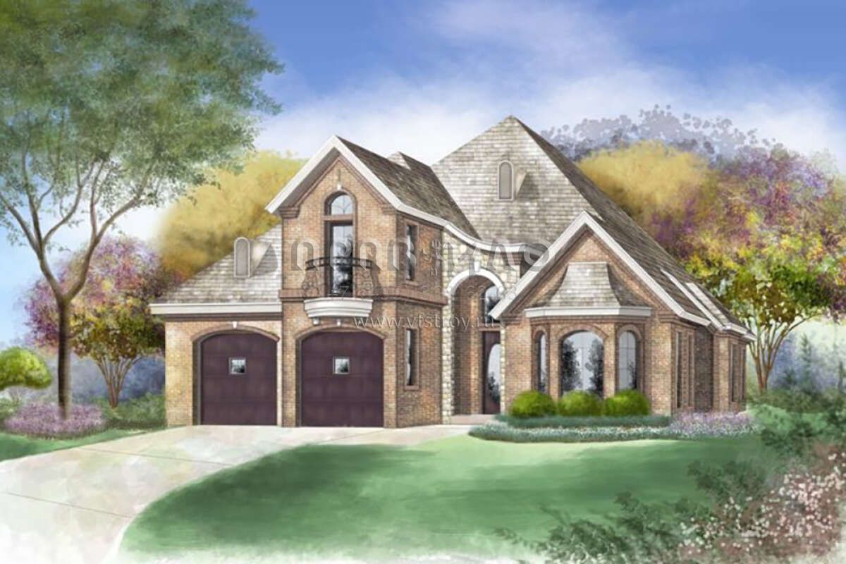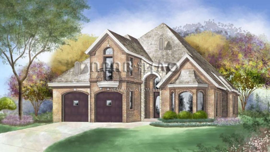 Это проект двухэтажного дома с гаражом на две машины жилой площадью 320 кв.м. Длина дома 25 м, ширина 14.6 м, высота 10.7 м. В доме три спальни и три санузла.