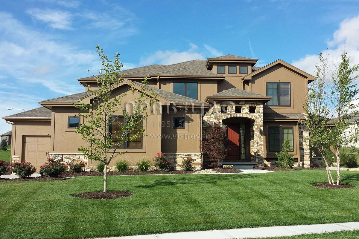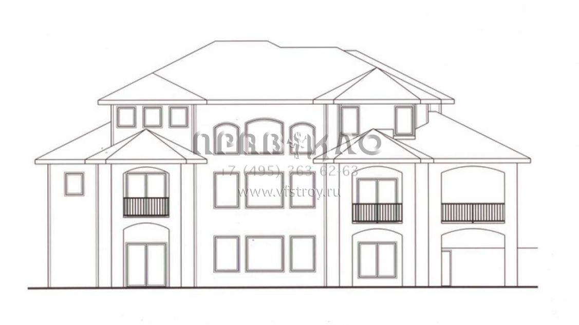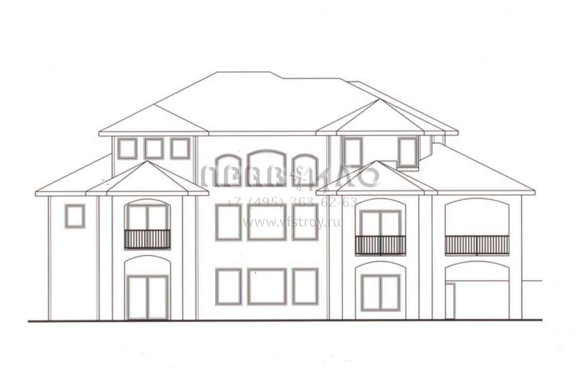 Это проект двухэтажного дома с гаражом на три и более машин жилой площадью 320 кв.м. Длина дома 22.6 м, ширина 21.9 м, высота 8.2 м. В доме четыре спальни и три санузла.