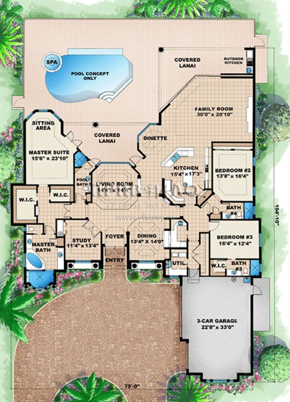 Это проект одноэтажного дома с гаражом на три и более машин жилой площадью 326 кв.м. Длина дома 31.7 м, ширина 22.9 м, высота 7.9 м. В доме три спальни и три санузла.