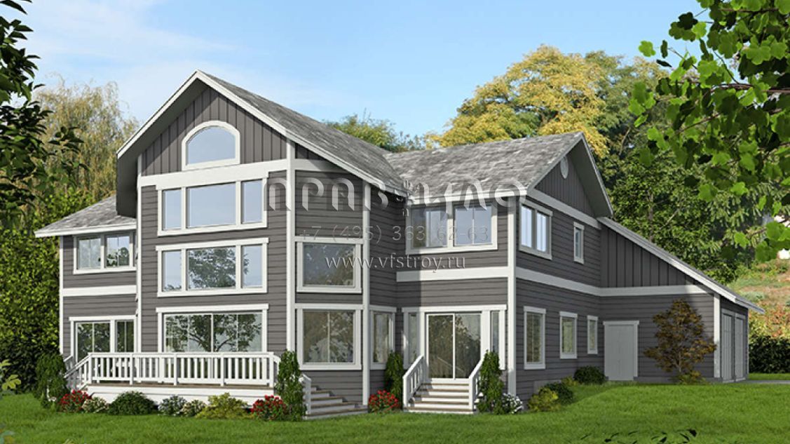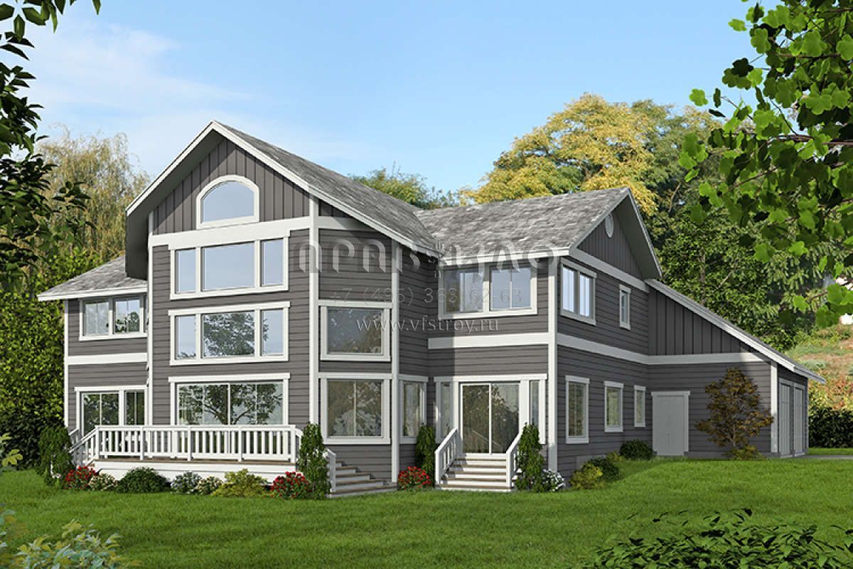 Это проект двухэтажного дома с гаражом на две машины жилой площадью 327 кв.м. Длина дома 22.9 м, ширина 22.9 м, высота 10.1 м. В доме три спальни и два санузла.