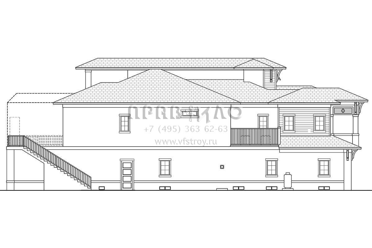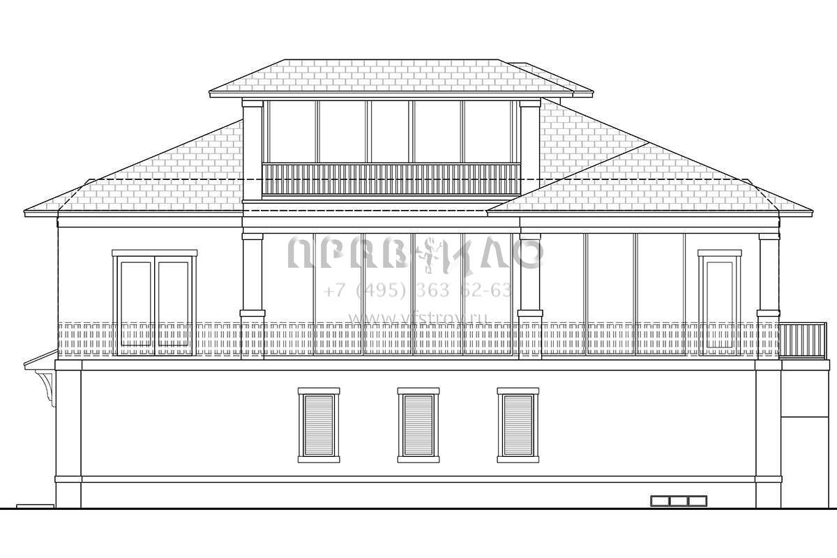 Это проект трехэтажного дома с гаражом на три и более машин жилой площадью 334 кв.м. Длина дома 29 м, ширина 18.6 м, высота 11.3 м. В доме четыре спальни и четыре санузла.