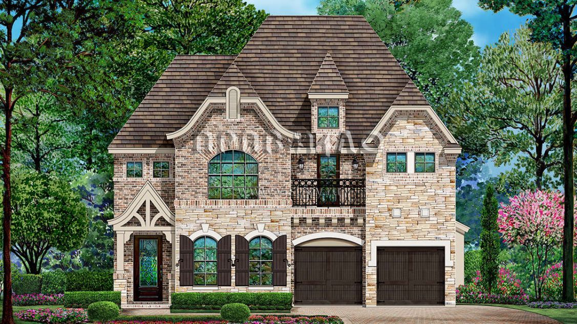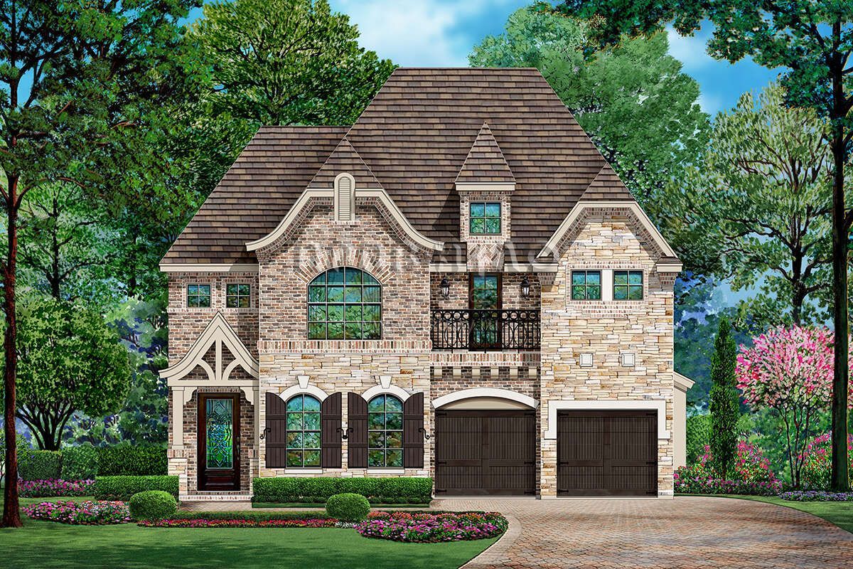 Это проект двухэтажного дома с гаражом на две машины жилой площадью 335 кв.м. Длина дома 22.9 м, ширина 12.2 м, высота 10.7 м. В доме три спальни и два санузла.