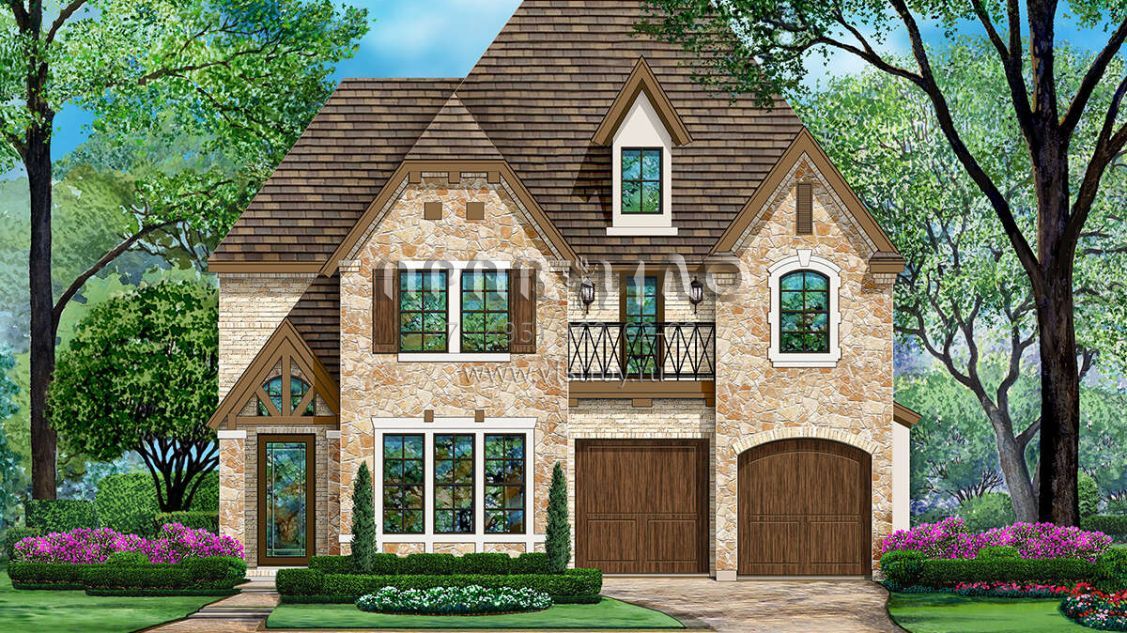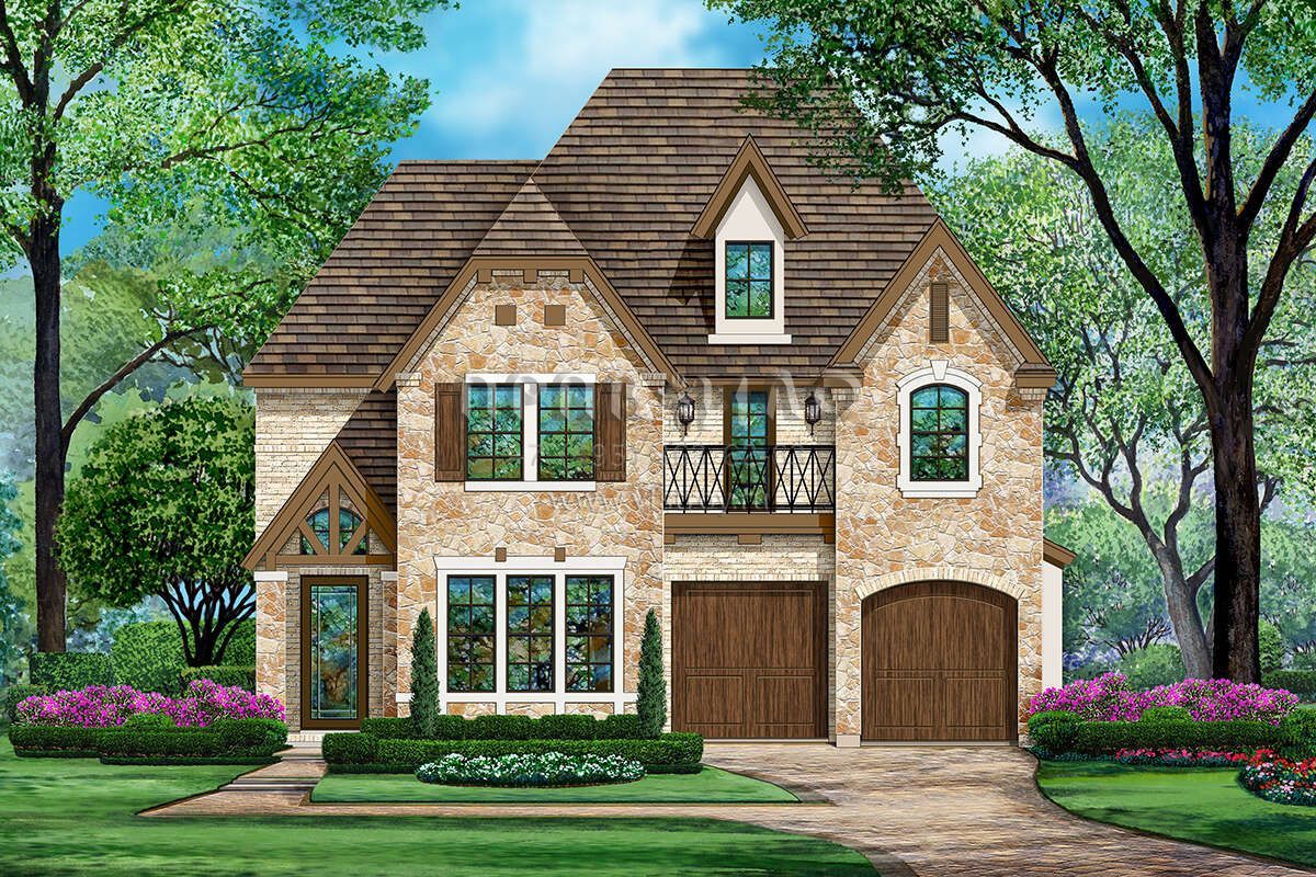 Это проект двухэтажного дома с гаражом на две машины жилой площадью 335 кв.м. Длина дома 22.9 м, ширина 12.2 м, высота 10.7 м. В доме три спальни и два санузла.