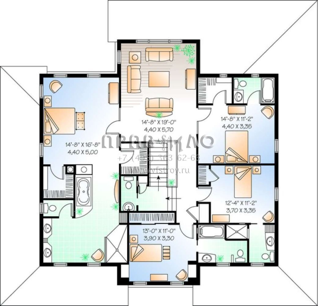 Это проект двухэтажного дома с гаражом на две машины жилой площадью 336 кв.м. Длина дома 15.2 м, ширина 15.8 м, высота 11.9 м. В доме четыре спальни и четыре санузла.