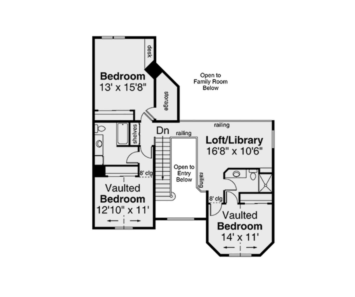 Двухэтажный проект дома позволяет рационально распорядиться площадью участка небольшого размера или узкой формы. На первом этаже находятся общие комнаты (гостиная/столовая, кухня, подсобные и технические помещения), на втором — спальни членов семьи.