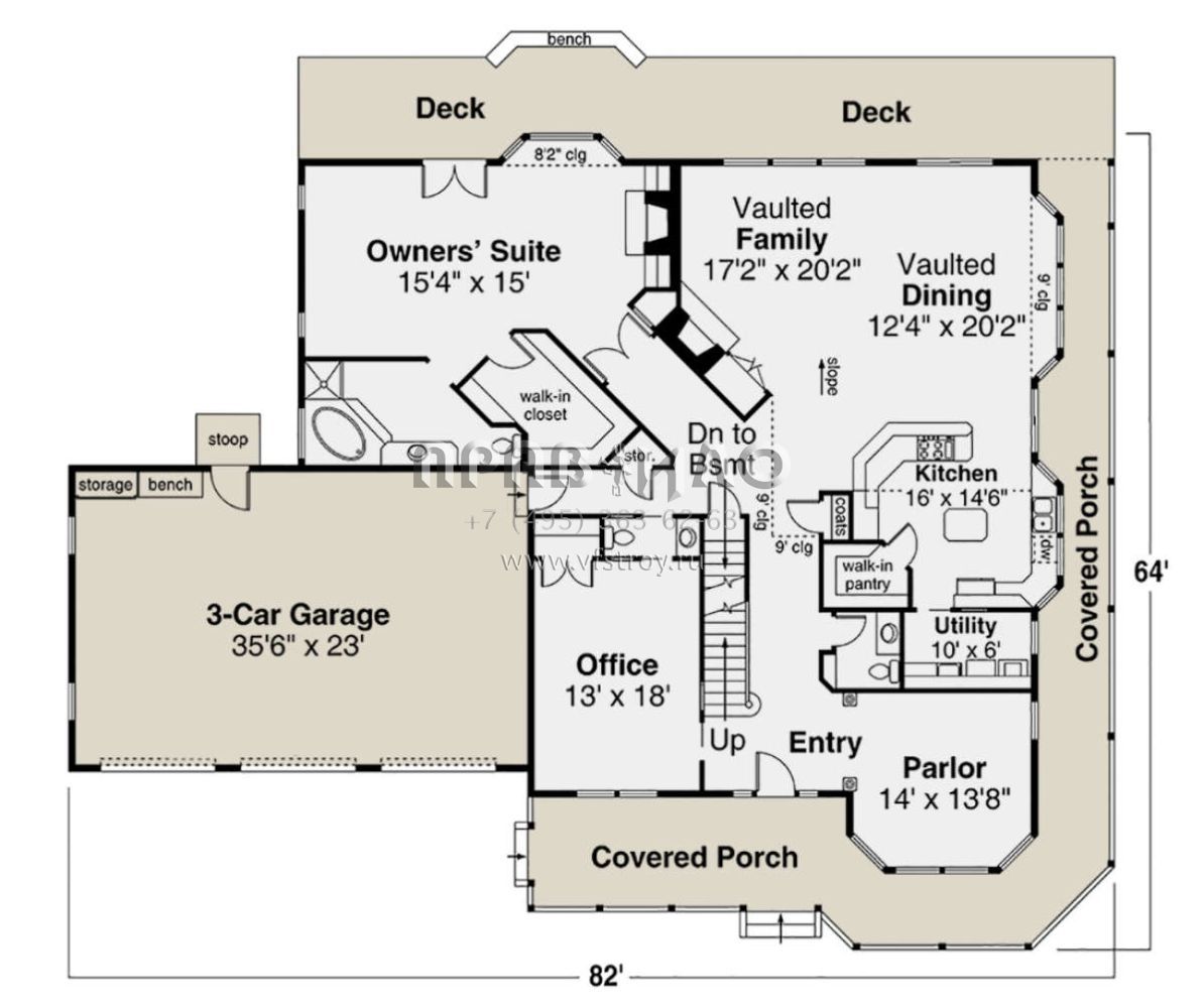 S5-347 (035-01058) Это иностранный проект, для которого требуется адаптация под нормы, действующие в Российской Федерации. Вы видите проект дома в стиле Ранчо. В этом доме сочетаются черты сельской постройки и аскетичность лофта. Внутри жильцы смогут проводить время с максимальным комфортом. Обратим внимание, что сейчас на планировках все размеры представлены в футах. Для перевода в метры вам необходимо значение в футах умножить на 0,3048.