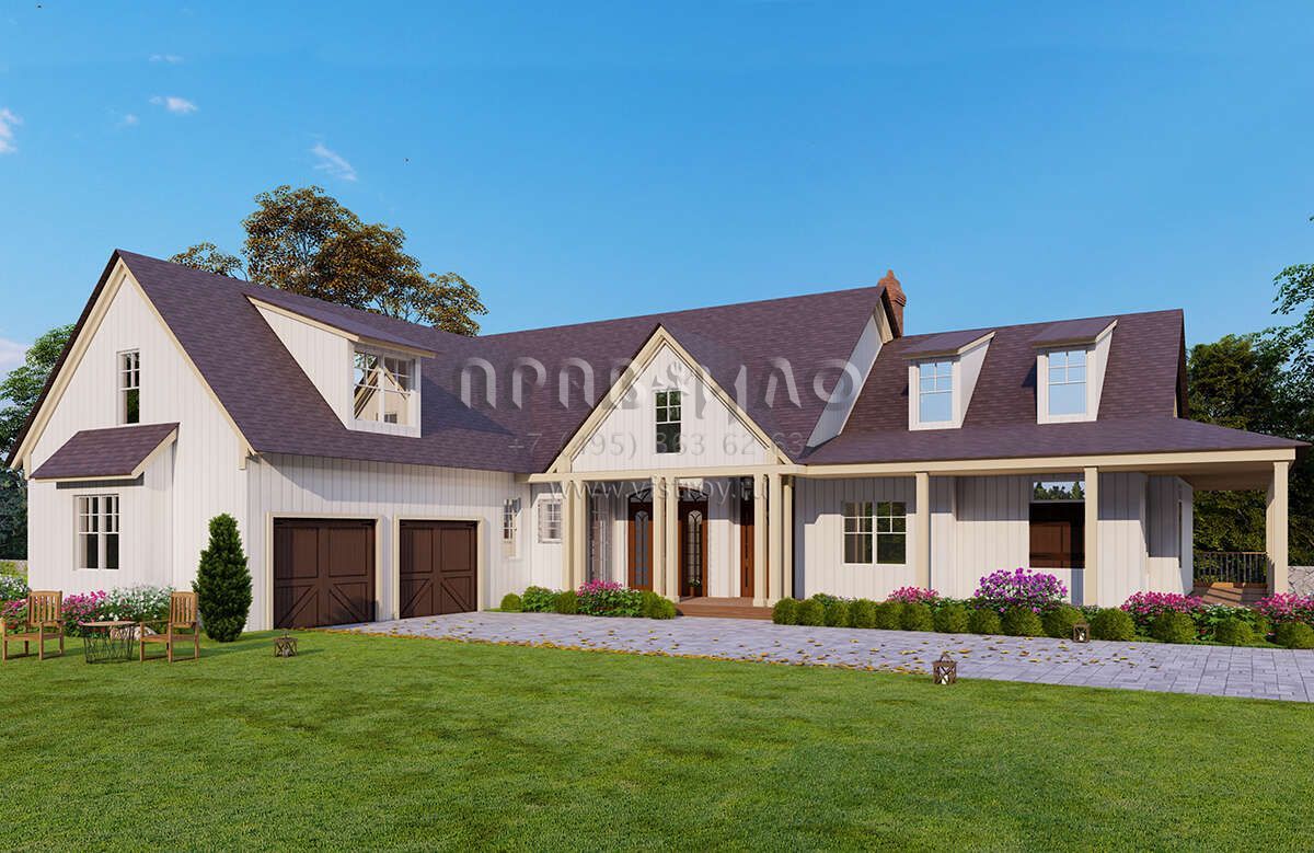 Это проект двухэтажного дома с гаражом на две машины жилой площадью 349 кв.м. Длина дома 27.1 м, ширина 24.4 м, высота 8.2 м. В доме пять спален и четыре санузла.