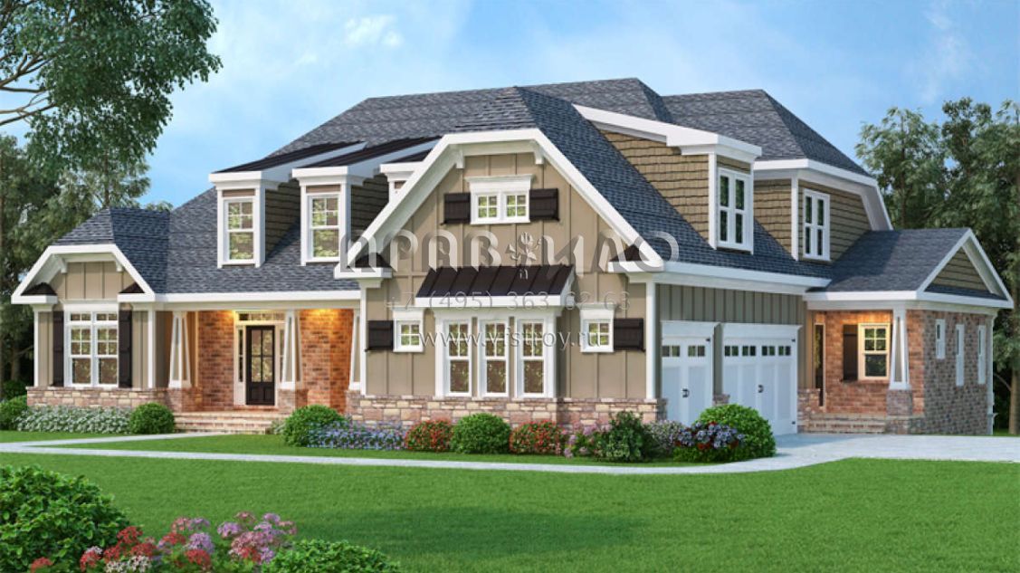 Это проект двухэтажного дома с гаражом на три и более машин жилой площадью 350 кв.м. Длина дома 21.3 м, ширина 22.9 м, высота 8.5 м. В доме четыре спальни и четыре санузла.