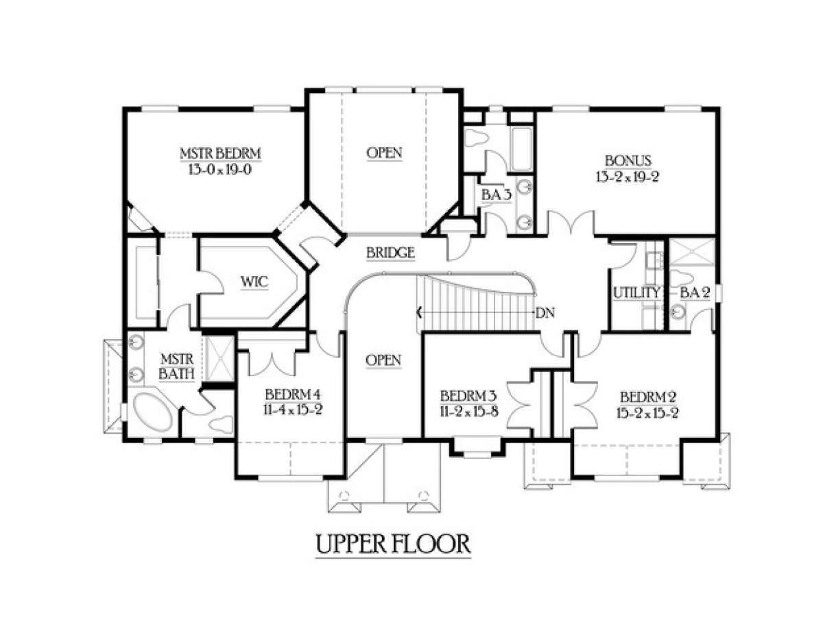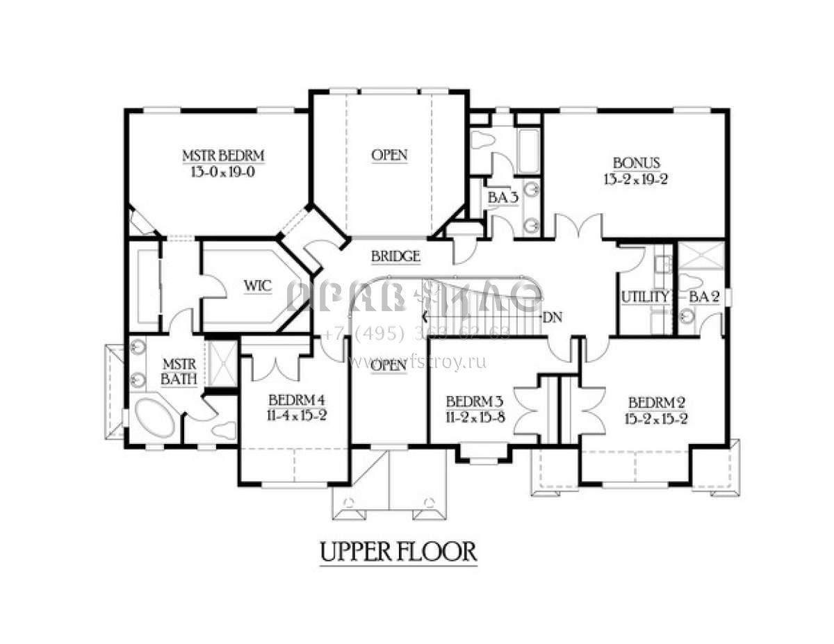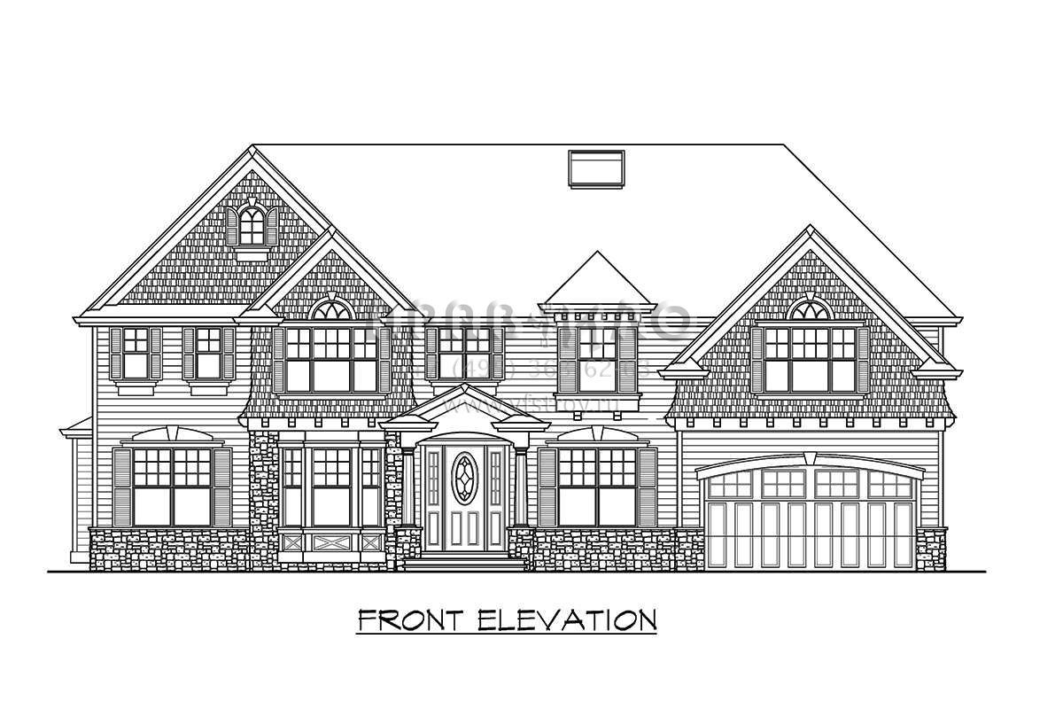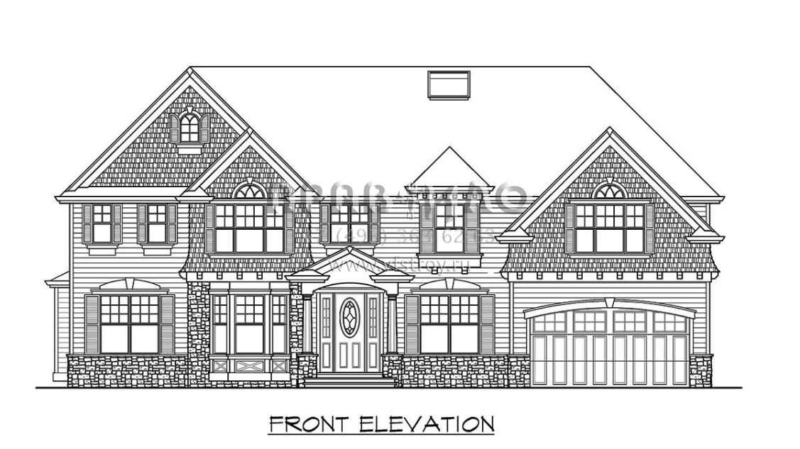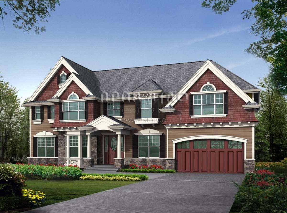 Это проект двухэтажного дома с гаражом на три и более машин жилой площадью 352 кв.м. Длина дома 13.7 м, ширина 19.5 м, высота 9.1 м. В доме пять спален и четыре санузла.
