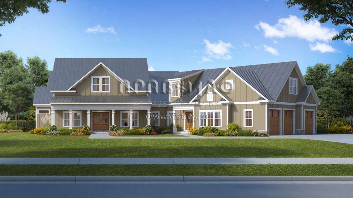 Это проект двухэтажного дома с гаражом на три и более машин жилой площадью 352 кв.м. Длина дома 24.4 м, ширина 32 м, высота 8.8 м. В доме три спальни и четыре санузла.