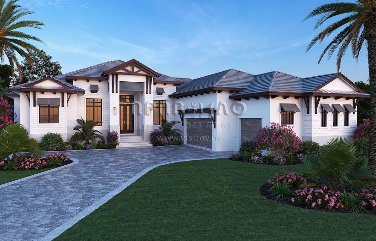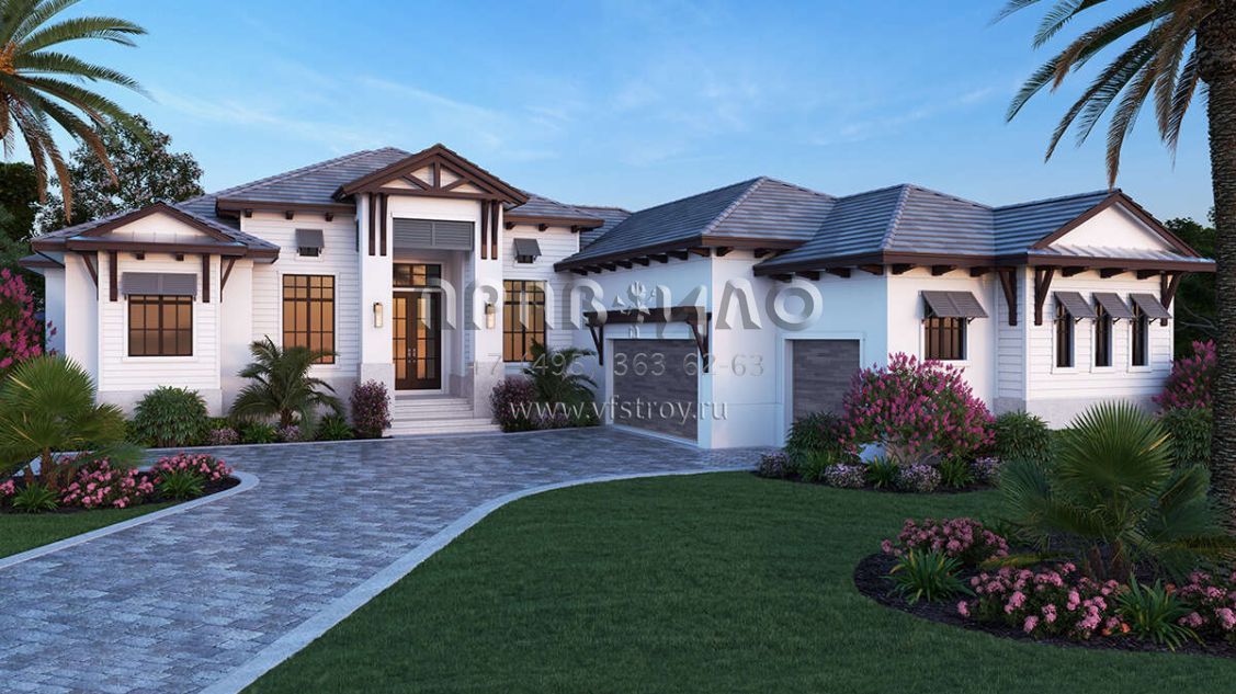 Проект одноэтажного дома с гаражом на три и более машин в прибрежном стиле S5-357 (207-00120)