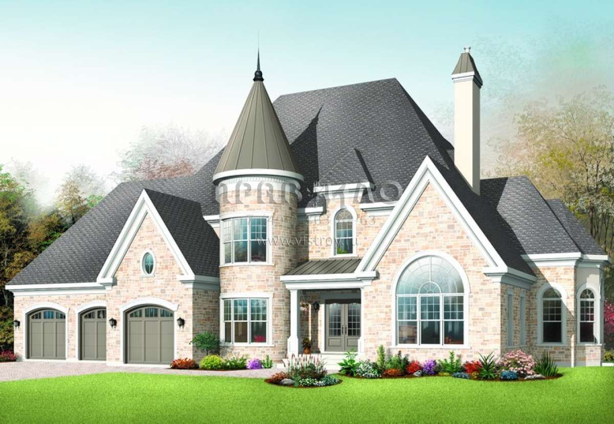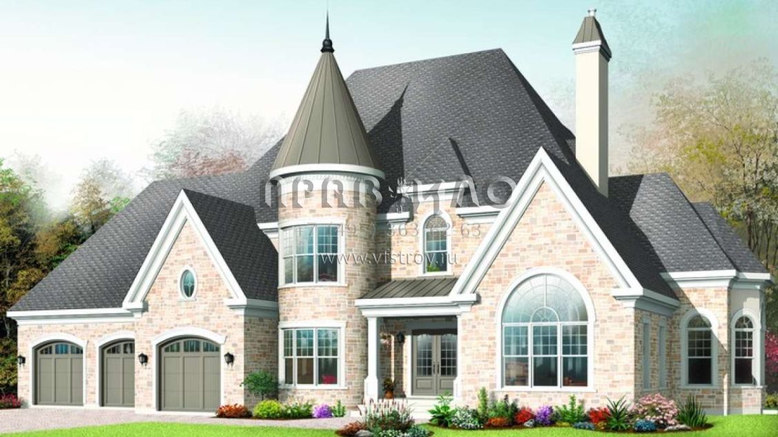 Это проект двухэтажного дома с гаражом на три и более машин жилой площадью 359 кв.м. Длина дома 15.2 м, ширина 28 м, высота 12.5 м. В доме три спальни и три санузла.