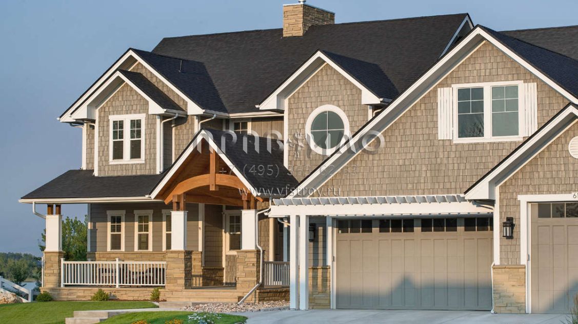 Это проект двухэтажного дома с гаражом на три и более машин жилой площадью 360 кв.м. Длина дома 21.6 м, ширина 24.1 м, высота 10.7 м. В доме три спальни и три санузла.