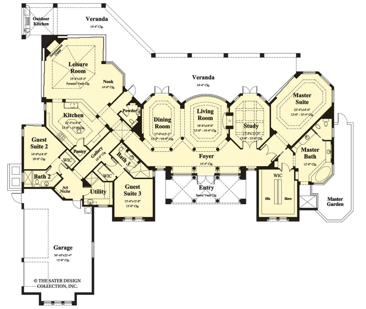 Это проект одноэтажного дома с гаражом на три и более машин жилой площадью 360 кв.м. Длина дома 29.9 м, ширина 31.1 м, высота 0 м. В доме три спальни и три санузла.