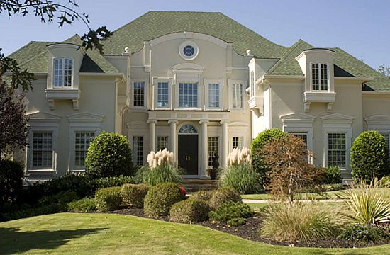 Это проект двухэтажного дома с гаражом на две машины жилой площадью 365 кв.м. Длина дома 25.6 м, ширина 22.9 м, высота 0 м. В доме пять спален и три санузла.