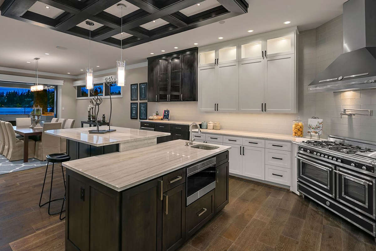 Это проект двухэтажного дома с гаражом на две машины жилой площадью 366 кв.м. Длина дома 21 м, ширина 17.7 м, высота 0 м. В доме три спальни и три санузла.