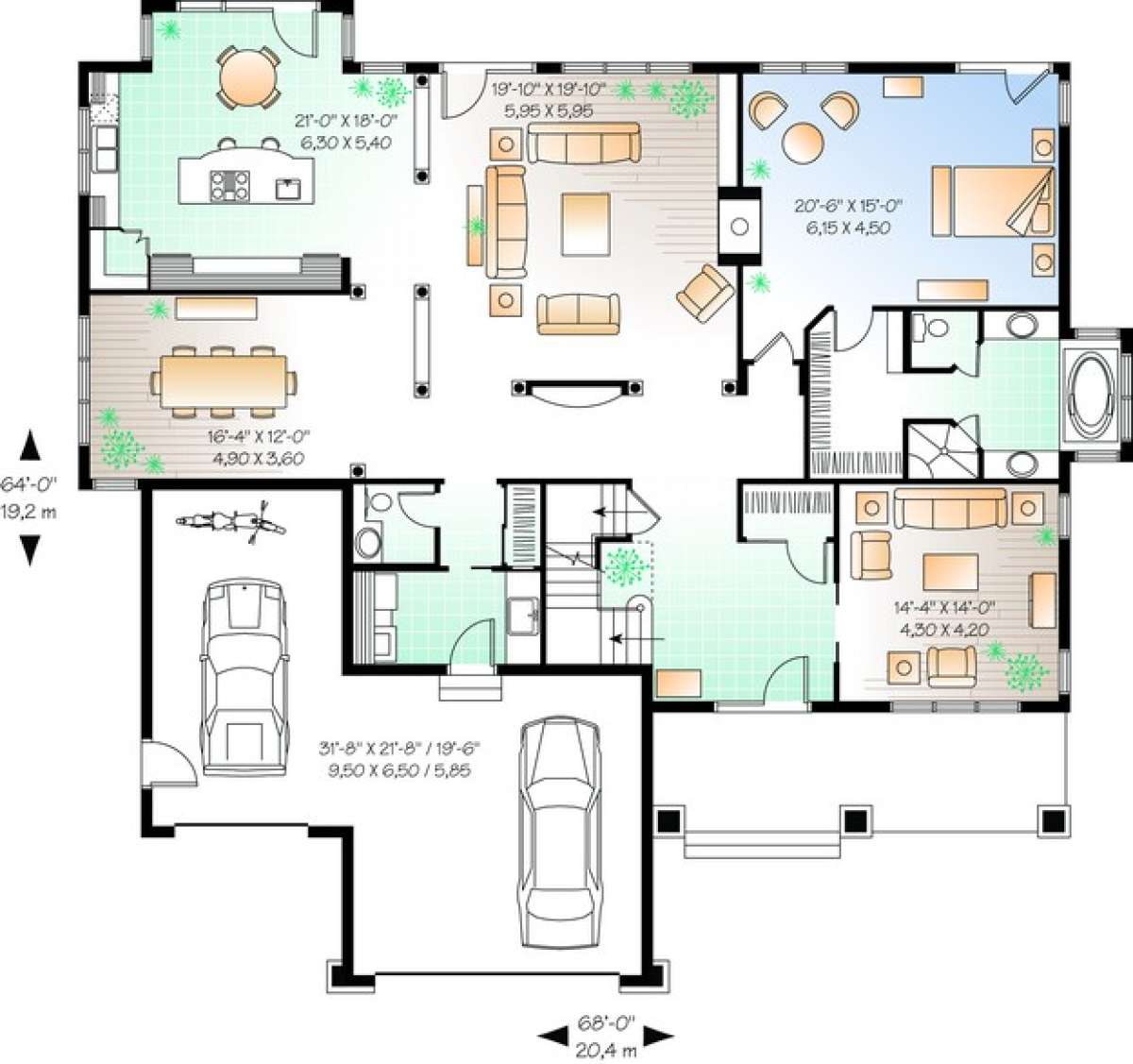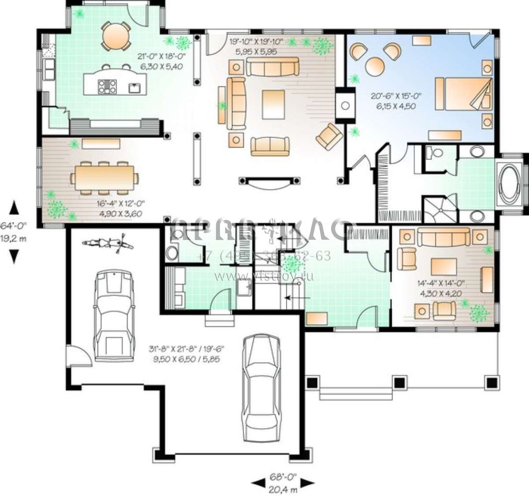 Это проект двухэтажного дома с гаражом на три и более машин жилой площадью 367 кв.м. Длина дома 19.5 м, ширина 20.7 м, высота 9.1 м. В доме четыре спальни и три санузла.