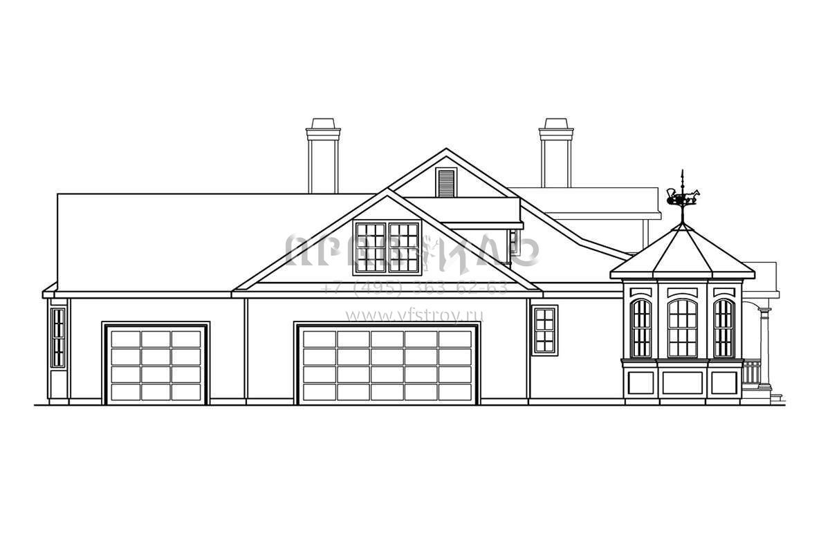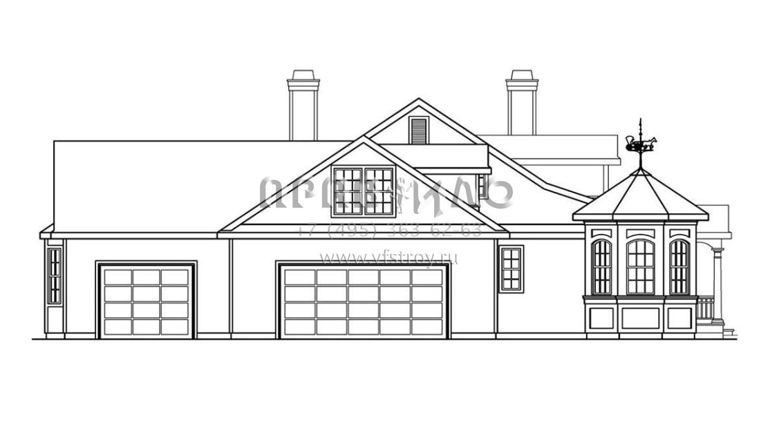 Это проект двухэтажного дома с гаражом на три и более машин жилой площадью 368 кв.м. Длина дома 25.3 м, ширина 36.3 м, высота 7.9 м. В доме четыре спальни и пять санузлов.
