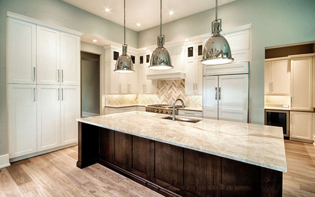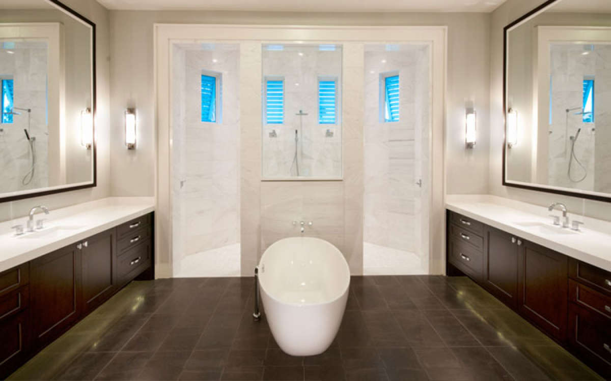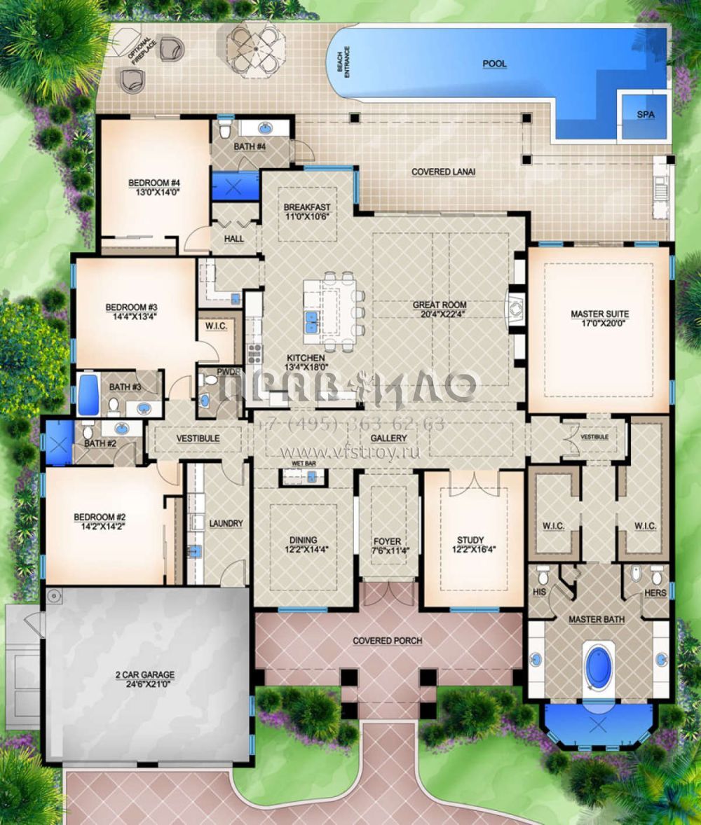 Это проект одноэтажного дома с гаражом на две машины жилой площадью 373 кв.м. Длина дома 23.8 м, ширина 23.2 м, высота 8.5 м. В доме четыре спальни и четыре санузла.