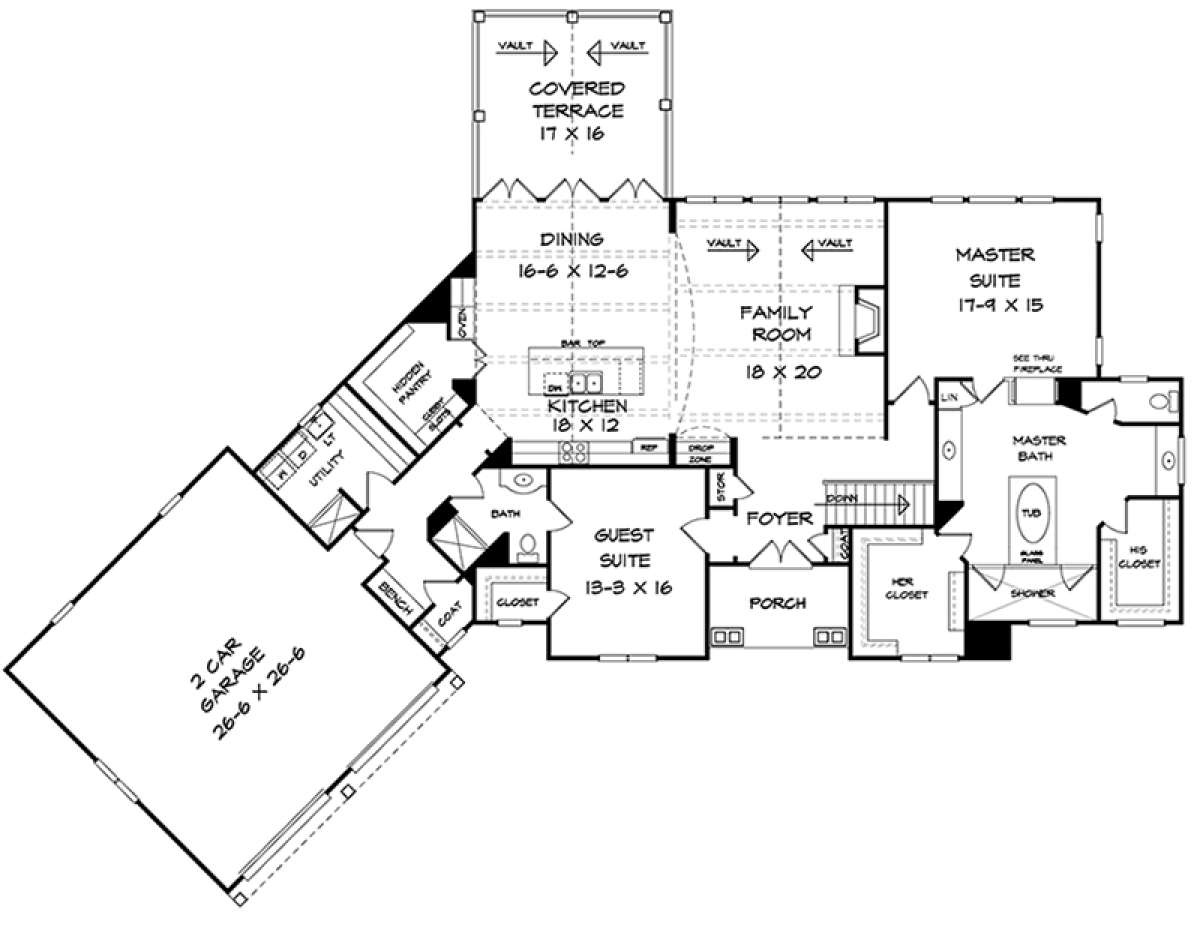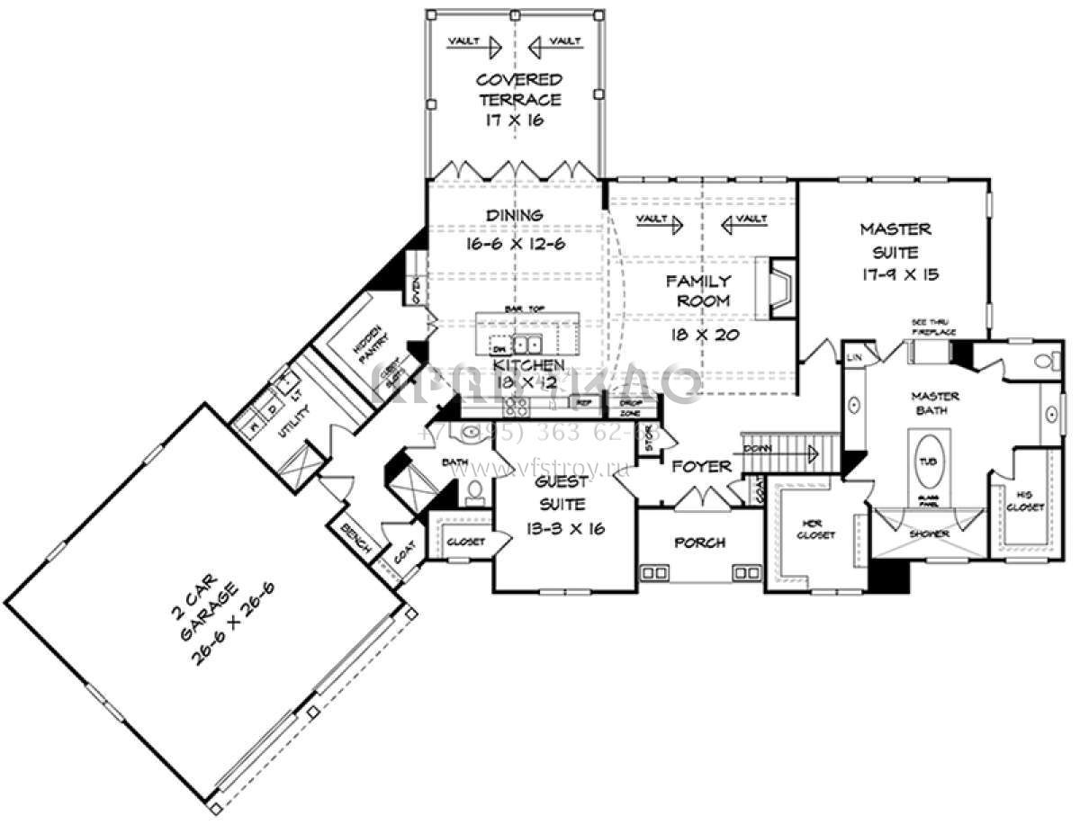 S5-376 (6082-00003) Это иностранный проект, для которого требуется адаптация под нормы, действующие в Российской Федерации. Вы видите проект дома в стиле Ранчо. В этом доме сочетаются черты сельской постройки и аскетичность лофта. Внутри жильцы смогут проводить время с максимальным комфортом. Обратим внимание, что сейчас на планировках все размеры представлены в футах. Для перевода в метры вам необходимо значение в футах умножить на 0,3048.
