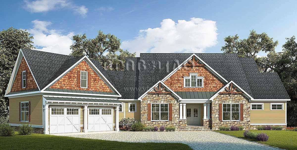Это проект одноэтажного дома с гаражом на две машины жилой площадью 376 кв.м. Длина дома 22.9 м, ширина 30.5 м, высота 9.1 м. В доме четыре спальни и четыре санузла.