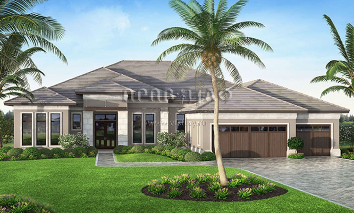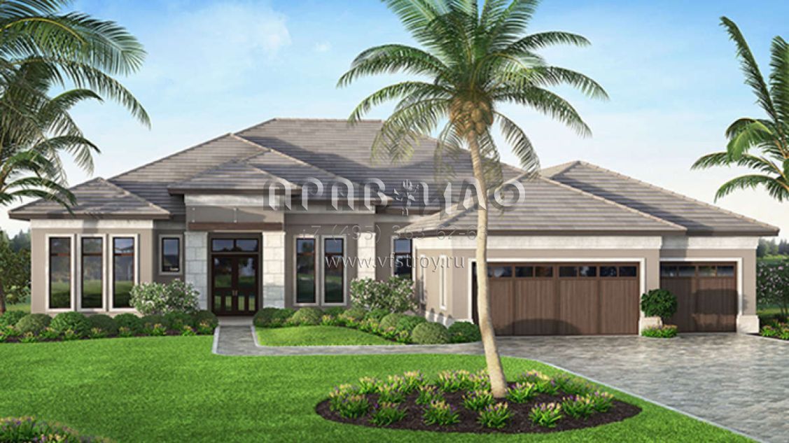Это проект одноэтажного дома с гаражом на три и более машин жилой площадью 383 кв.м. Длина дома 28 м, ширина 24.1 м, высота 8.5 м. В доме четыре спальни и четыре санузла.