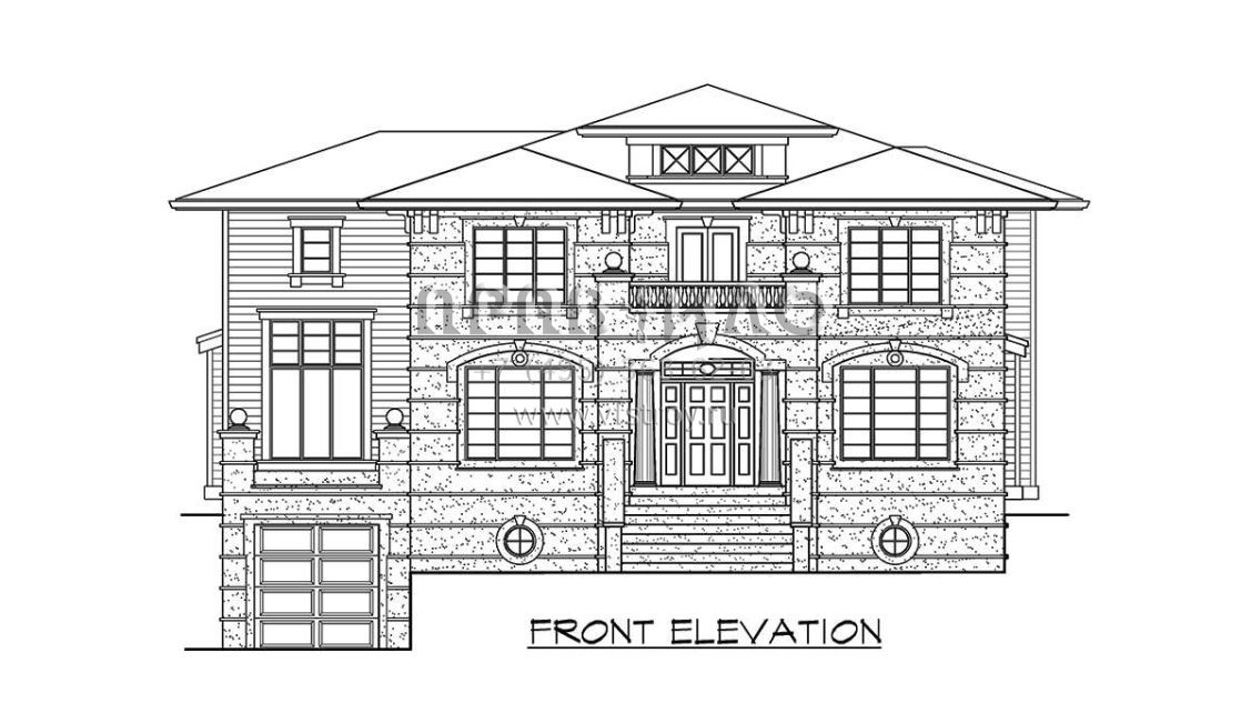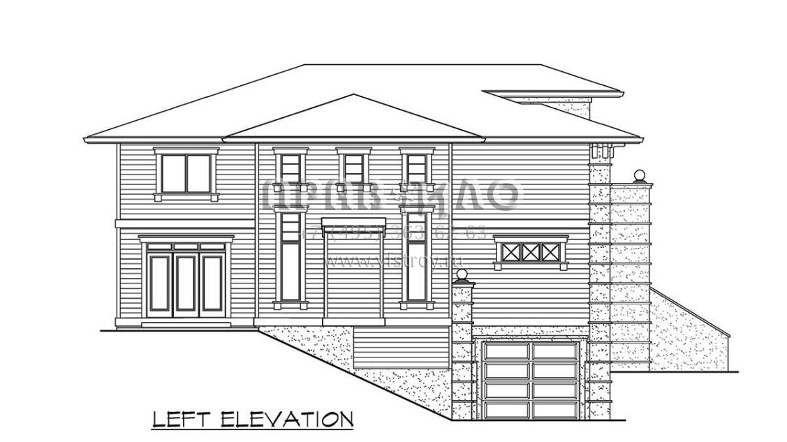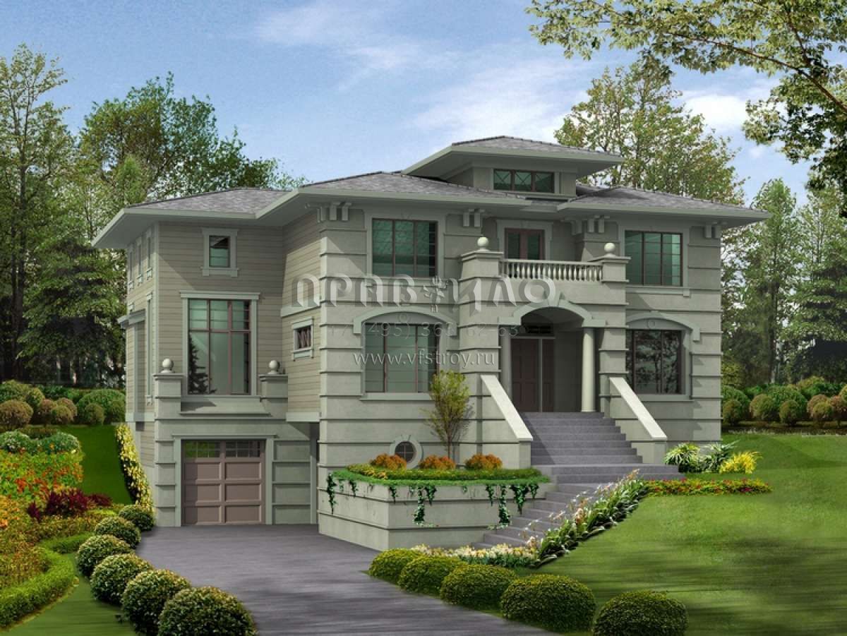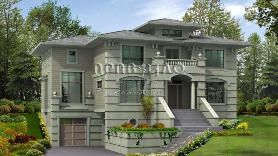 Это проект двухэтажного дома с гаражом на три и более машин жилой площадью 383 кв.м. Длина дома 16.5 м, ширина 16.2 м, высота 7.6 м. В доме пять спален и четыре санузла.