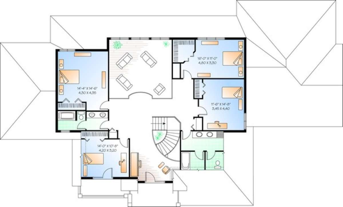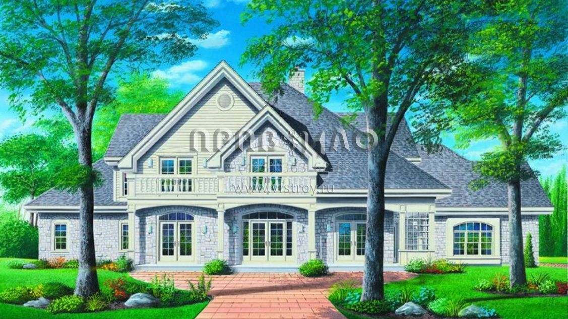 Это проект двухэтажного дома с гаражом на три и более машин жилой площадью 385 кв.м. Длина дома 15.5 м, ширина 29 м, высота 11.3 м. В доме пять спален и три санузла.