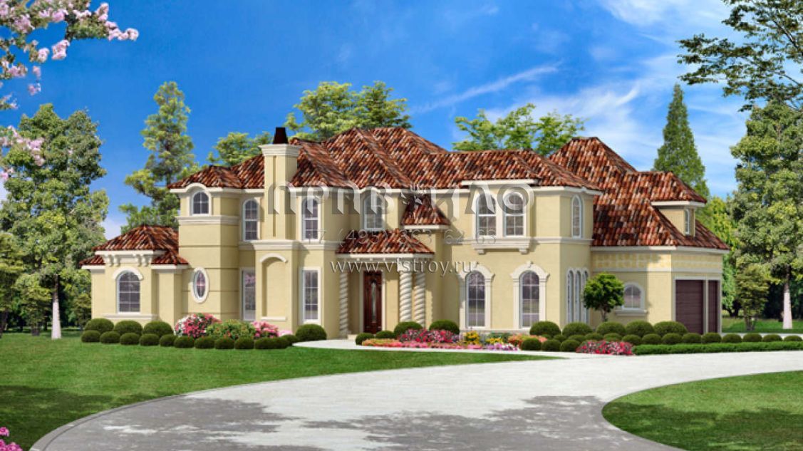 Это проект двухэтажного дома с гаражом на три и более машин жилой площадью 388 кв.м. Длина дома 19.8 м, ширина 29 м, высота 9.4 м. В доме четыре спальни и четыре санузла.