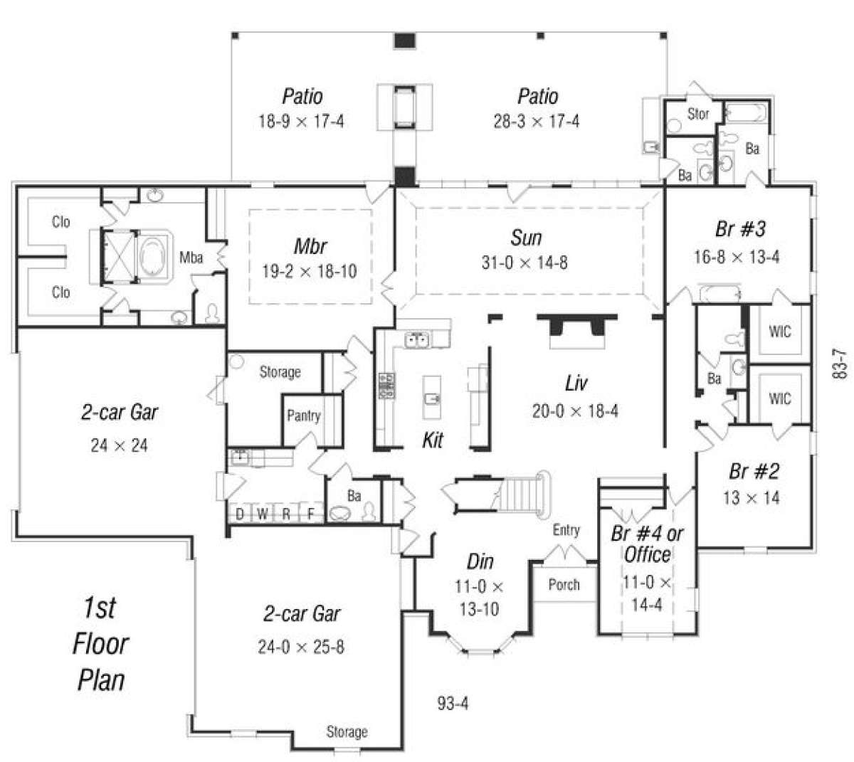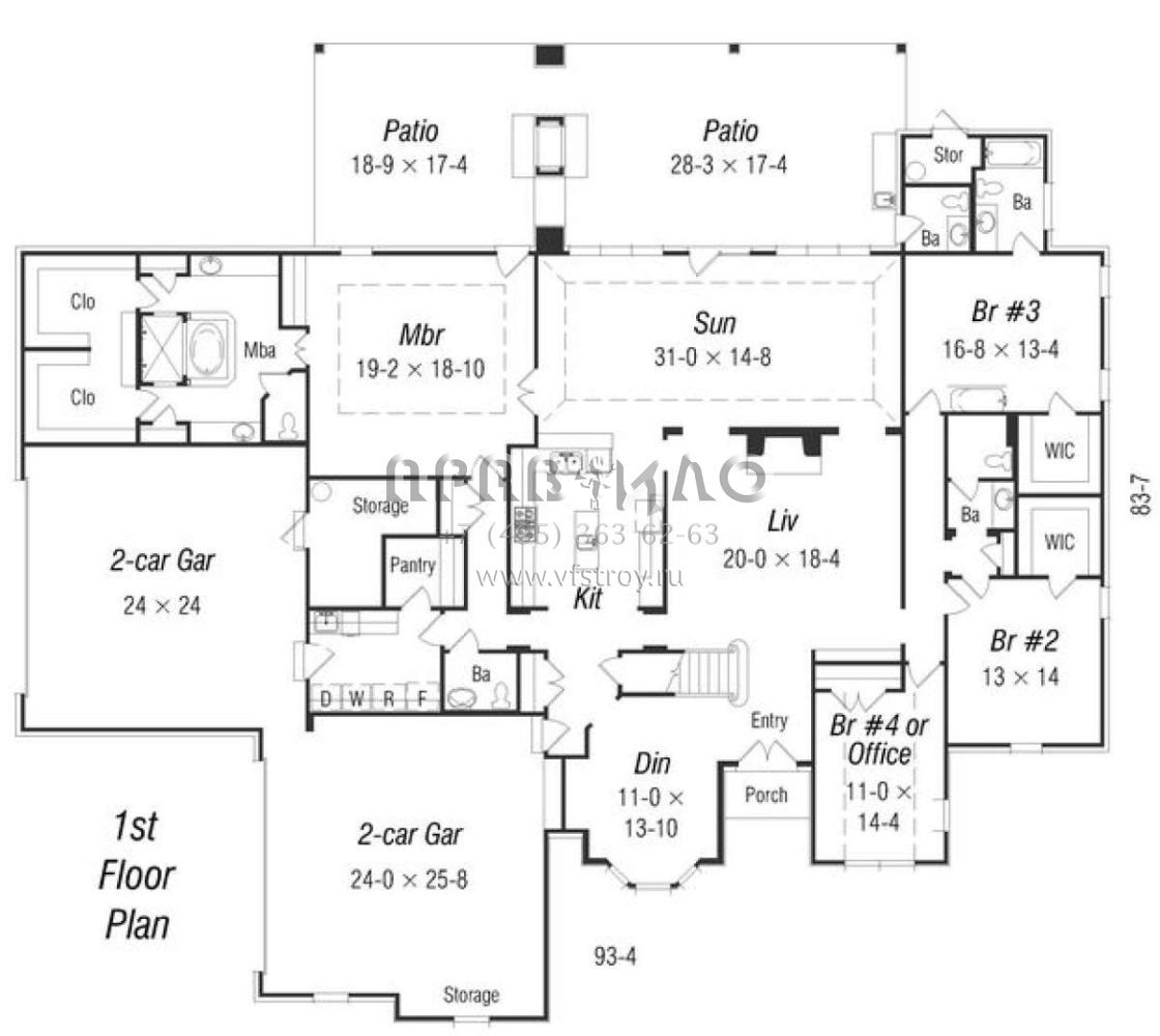 Это проект одноэтажного дома с гаражом на три и более машин жилой площадью 389 кв.м. Длина дома 25.3 м, ширина 28.3 м, высота 0 м. В доме четыре спальни и четыре санузла.