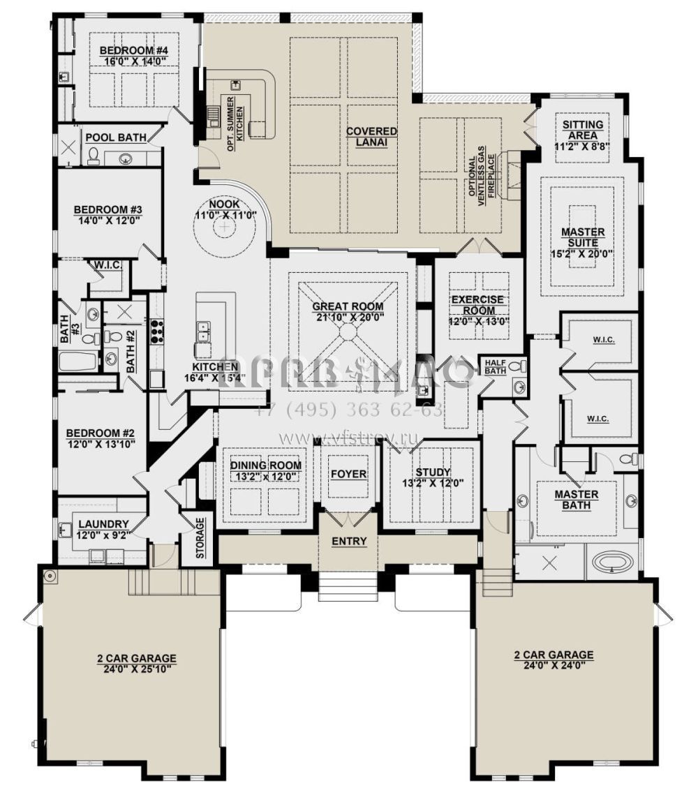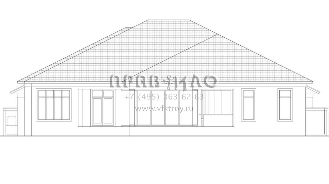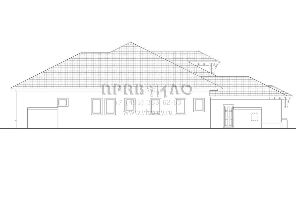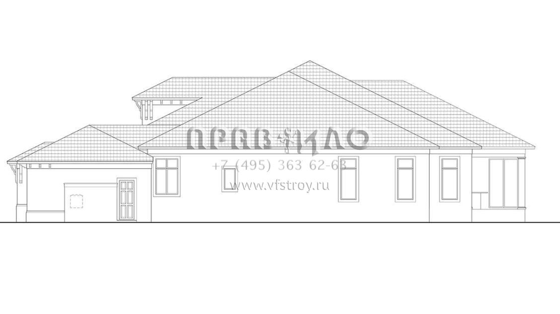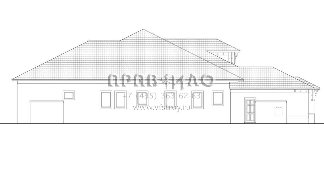 Это проект одноэтажного дома с гаражом на три и более машин жилой площадью 394 кв.м. Длина дома 31.4 м, ширина 25.3 м, высота 9.1 м. В доме четыре спальни и четыре санузла.
