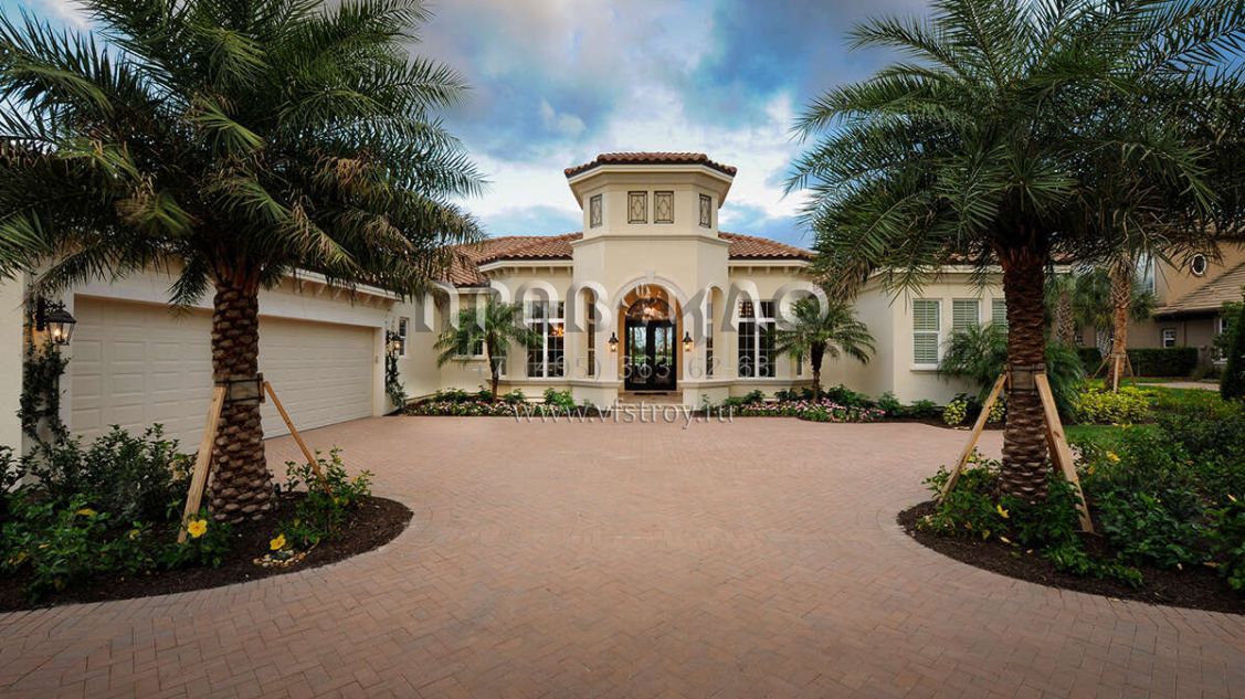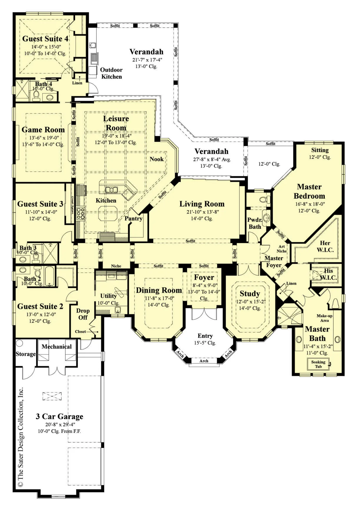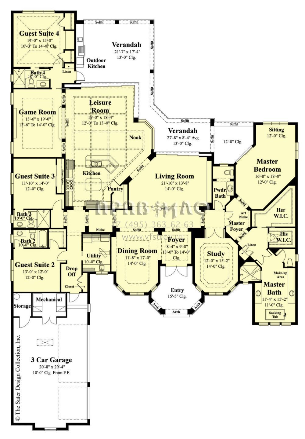 Это проект одноэтажного дома с гаражом на три и более машин жилой площадью 398 кв.м. Длина дома 35.4 м, ширина 24.4 м, высота 7.6 м. В доме четыре спальни и четыре санузла.