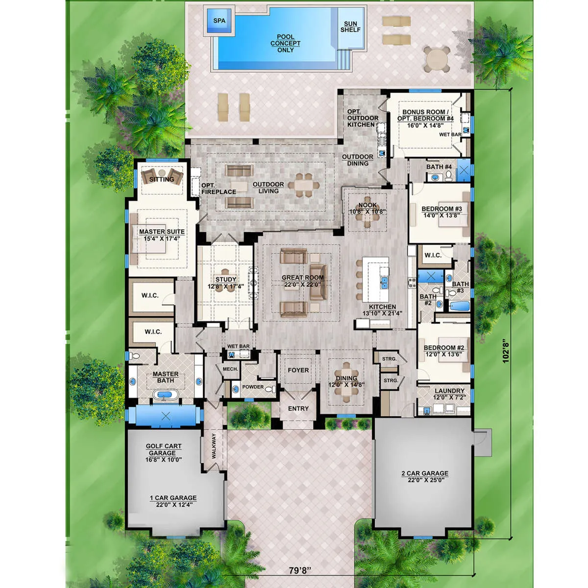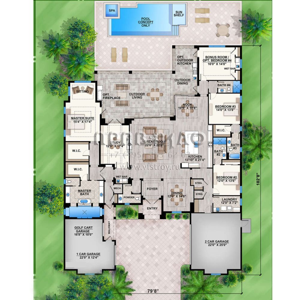 Проект одноэтажного дома с гаражом на три и более машин в прибрежном стиле S5-399 (5565-00048)