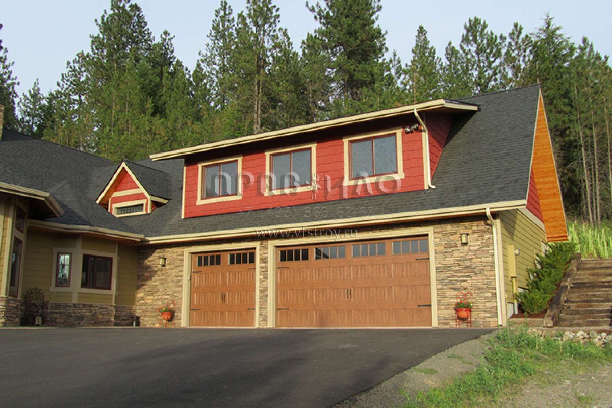 Это проект двухэтажного дома с гаражом на три и более машин жилой площадью 401 кв.м. Длина дома 17.4 м, ширина 32.6 м, высота 7.9 м. В доме три спальни и три санузла.