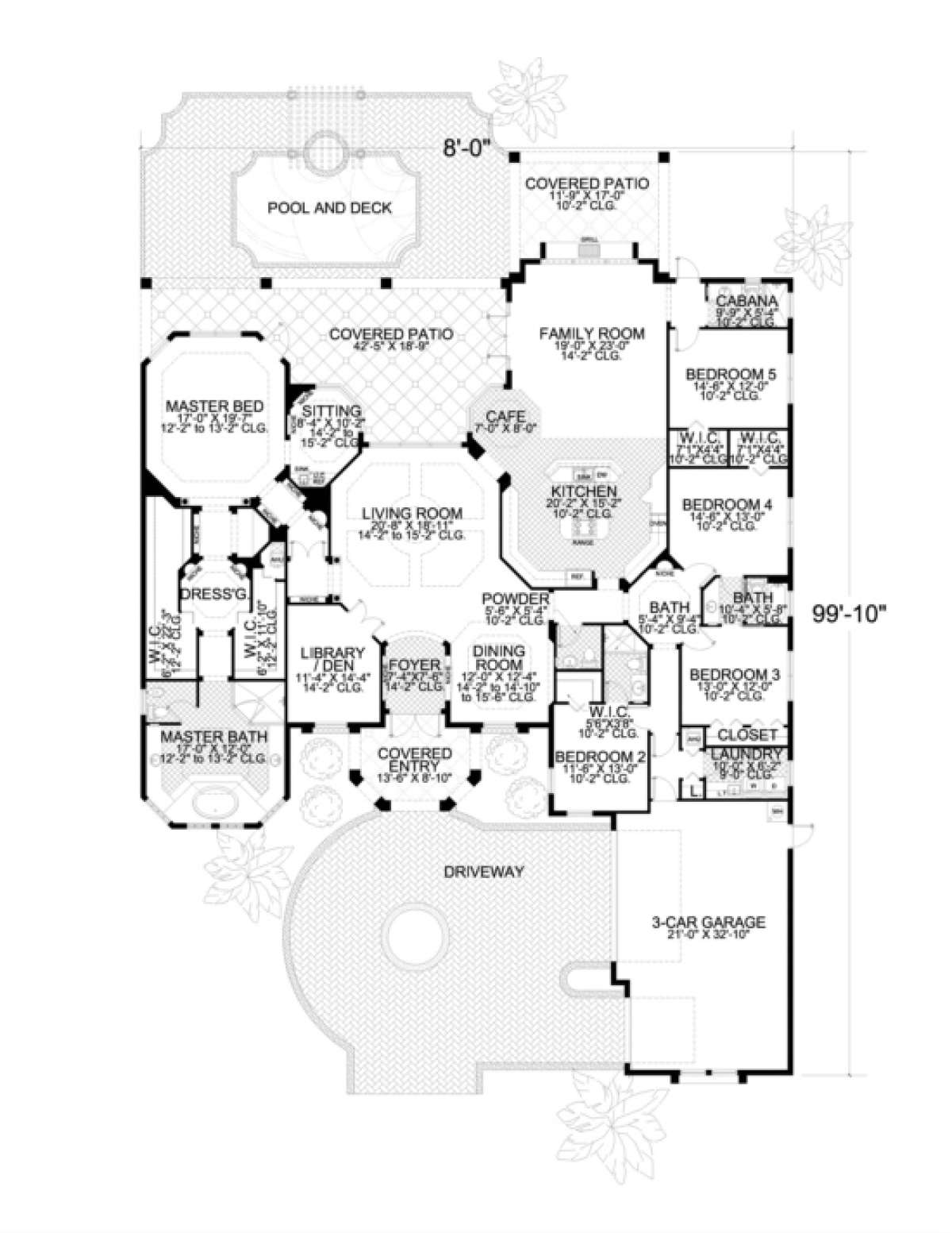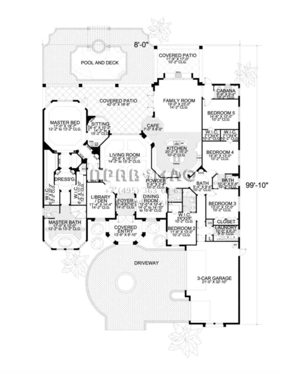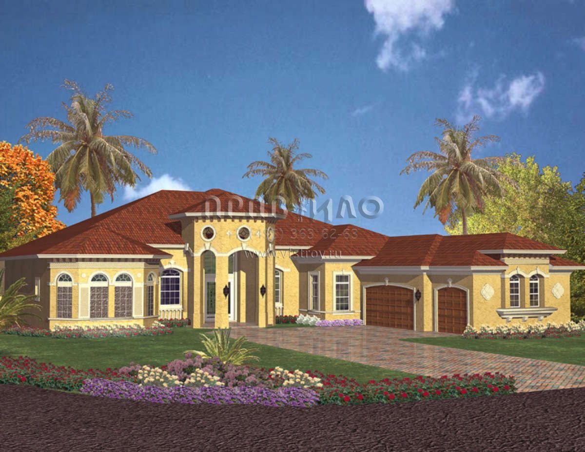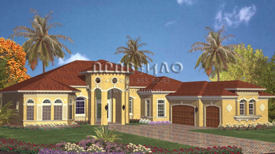 Это проект одноэтажного дома с гаражом на три и более машин жилой площадью 405 кв.м. Длина дома 30.2 м, ширина 24.4 м, высота 7 м. В доме пять спален и четыре санузла.