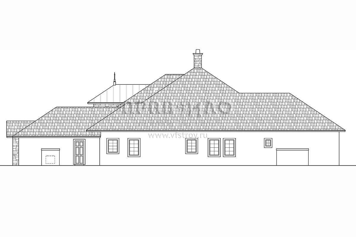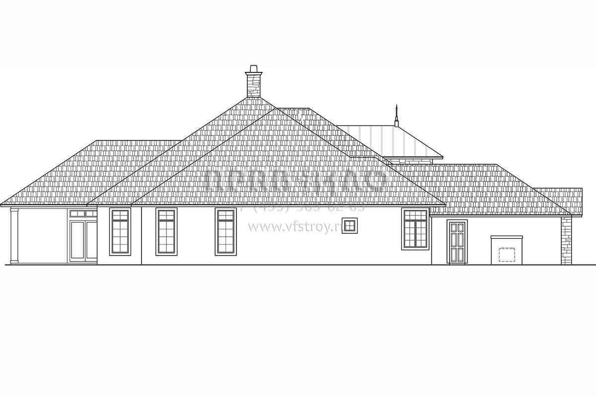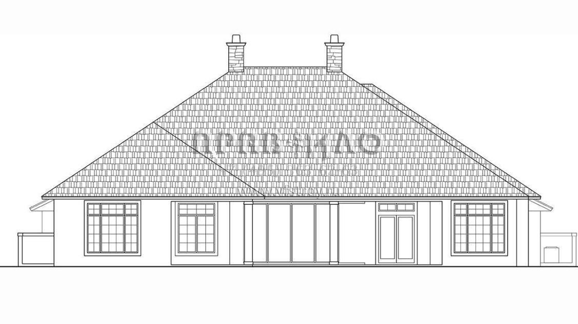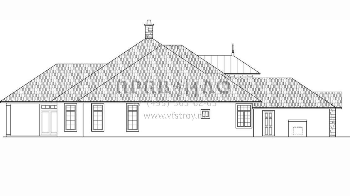 Это проект одноэтажного дома с гаражом на три и более машин жилой площадью 405 кв.м. Длина дома 33.2 м, ширина 25.3 м, высота 10.1 м. В доме три спальни и четыре санузла.