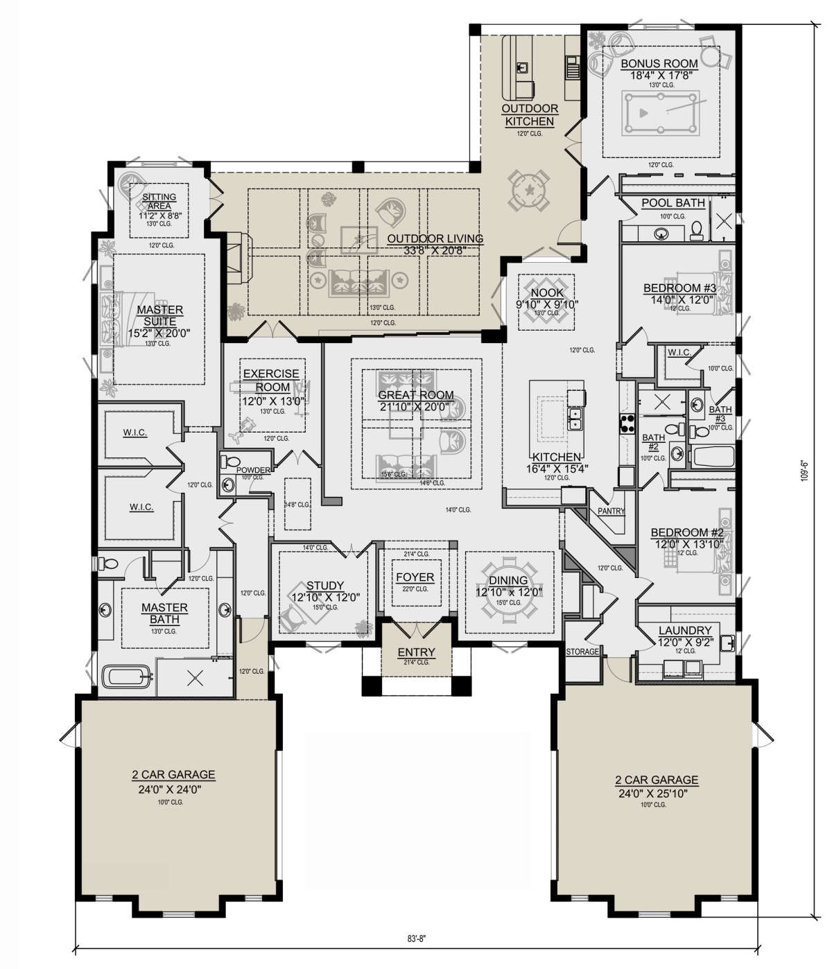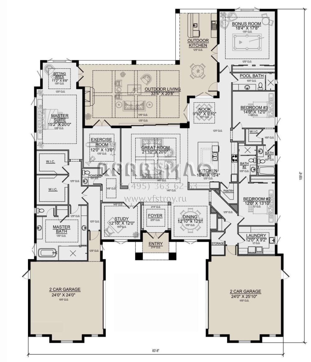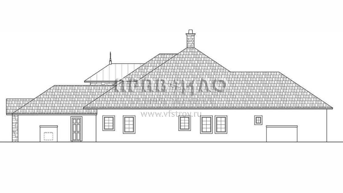 Это проект одноэтажного дома с гаражом на три и более машин жилой площадью 405 кв.м. Длина дома 33.2 м, ширина 25.3 м, высота 10.1 м. В доме три спальни и четыре санузла.