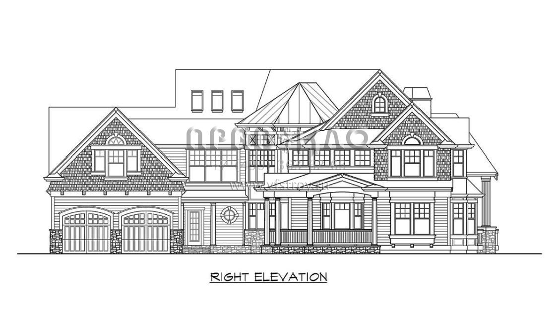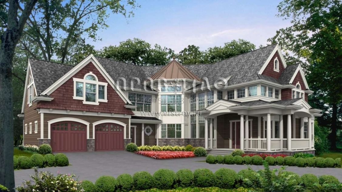 Это проект двухэтажного дома с гаражом на две машины жилой площадью 406 кв.м. Длина дома 25 м, ширина 25.9 м, высота 9.8 м. В доме три спальни и три санузла.