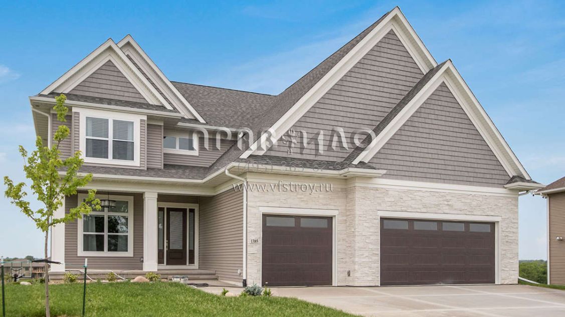 Это проект двухэтажного дома с гаражом на три и более машин жилой площадью 408 кв.м. Длина дома 20.1 м, ширина 16.8 м, высота 9.1 м. В доме шесть и более спален и четыре санузла.