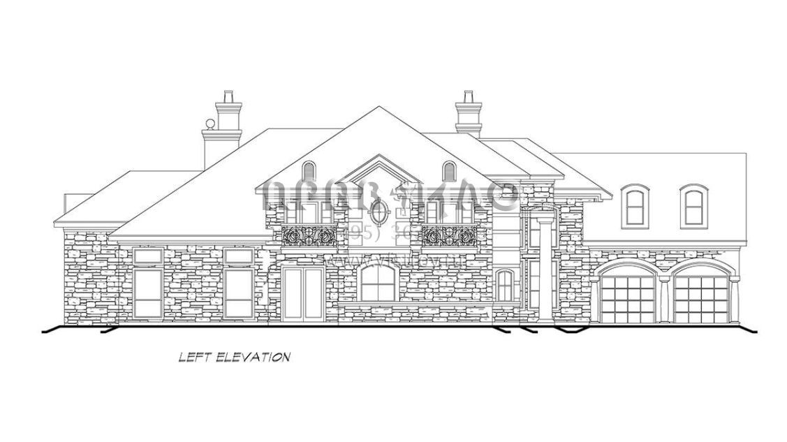 Это проект двухэтажного дома с гаражом на две машины жилой площадью 410 кв.м. Длина дома 30.5 м, ширина 13.7 м, высота 9.8 м. В доме три спальни и три санузла.