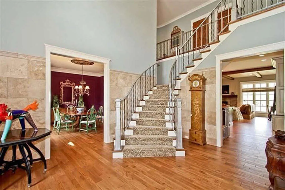 Это проект двухэтажного дома с гаражом на три и более машин жилой площадью 411 кв.м. Длина дома 18.9 м, ширина 30.8 м, высота 0 м. В доме пять спален и три санузла.